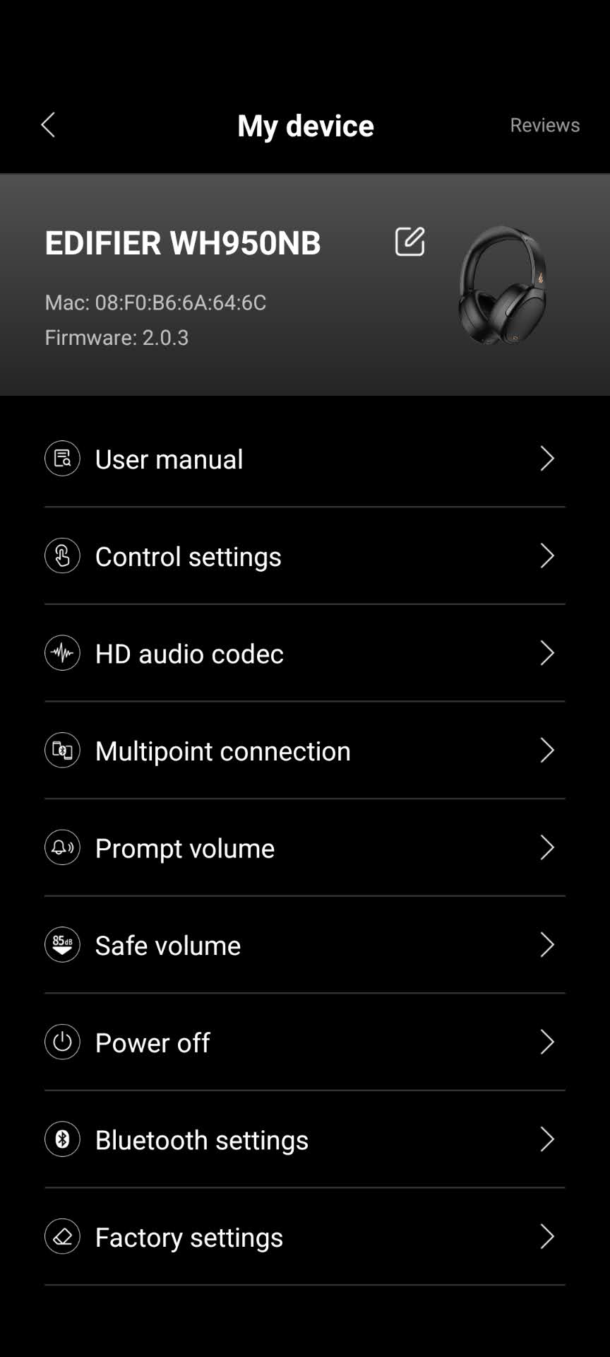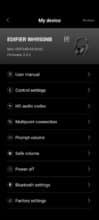 Für Smartphones steht die Edifier ConneX-App in englischer Sprache zur Verfügung. Die App zeigt die gekoppelten Edifier-Geräte an und ermöglicht umfangreiche Einstellungen. Auf der Startseite der App können das ANC, die Soundeffekte und der Soundmodus angepasst werden. Die weiteren Einstellungen umfassen unter anderem die Bedienung, den Codec und Multipoint. Der Kopfhörer unterstützt durch Multipoint die gleichzeitige Verbindung mit zwei Geräten, Multipoint wird jedoch nur ohne LDAC unterstützt.