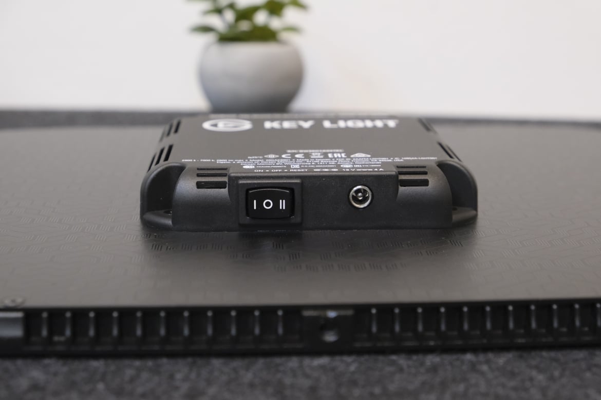 An dessen Unterseite finden wir den Ein-/Ausschalter samt dreier Betriebsmodi (von links: Ein, Aus, Reset), sowie rechts daneben den Anschluss für das Netzteil. Die Vorderseite wird zum größten Teil vom LED-Leuchtpanel eingenommen, das von einem schwarzen Aluminium-Rahmen mit einer Breite von ca. 1,6 Zentimetern umrandet wird. An der Ober- und Unterseite, sowie links und rechts am Rahmen findet sich jeweils in der Mitte ein 1/4-Zoll-Gewinde, mit dem das Key Light in die im Lieferumfang enthaltene Strange eingeschraubt werden kann. Allerdings lässt sich das Leuchtpanel damit auch einfach in eventuell vorhandene Stative integrieren.