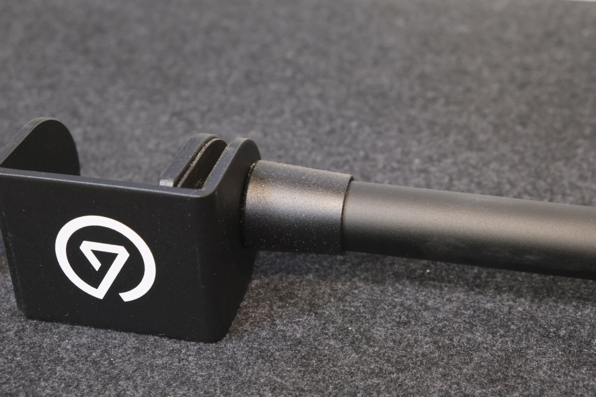 Das beiliegende Master Mount L ist aus robustem Metall gefertigt und verfügt an der Unterseite über einen Schraubmechanismus, um am Tisch oder einer Oberfläche befestigt werden zu können. An der Oberseite sitzen zwei gummierte Schrauben, die eine Einstellung der Höhe zwischen 55 cm und maximal 125 cm ermöglichen.