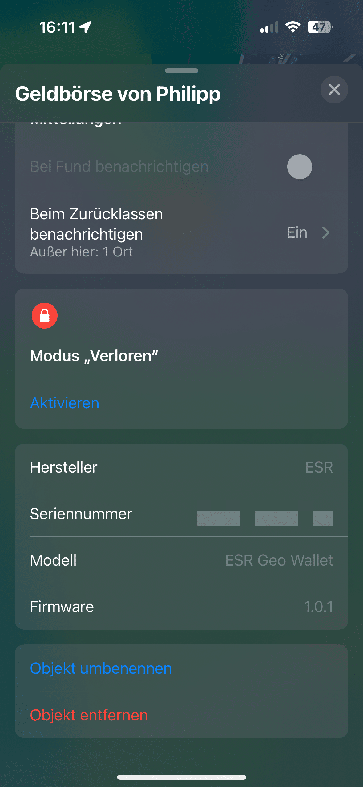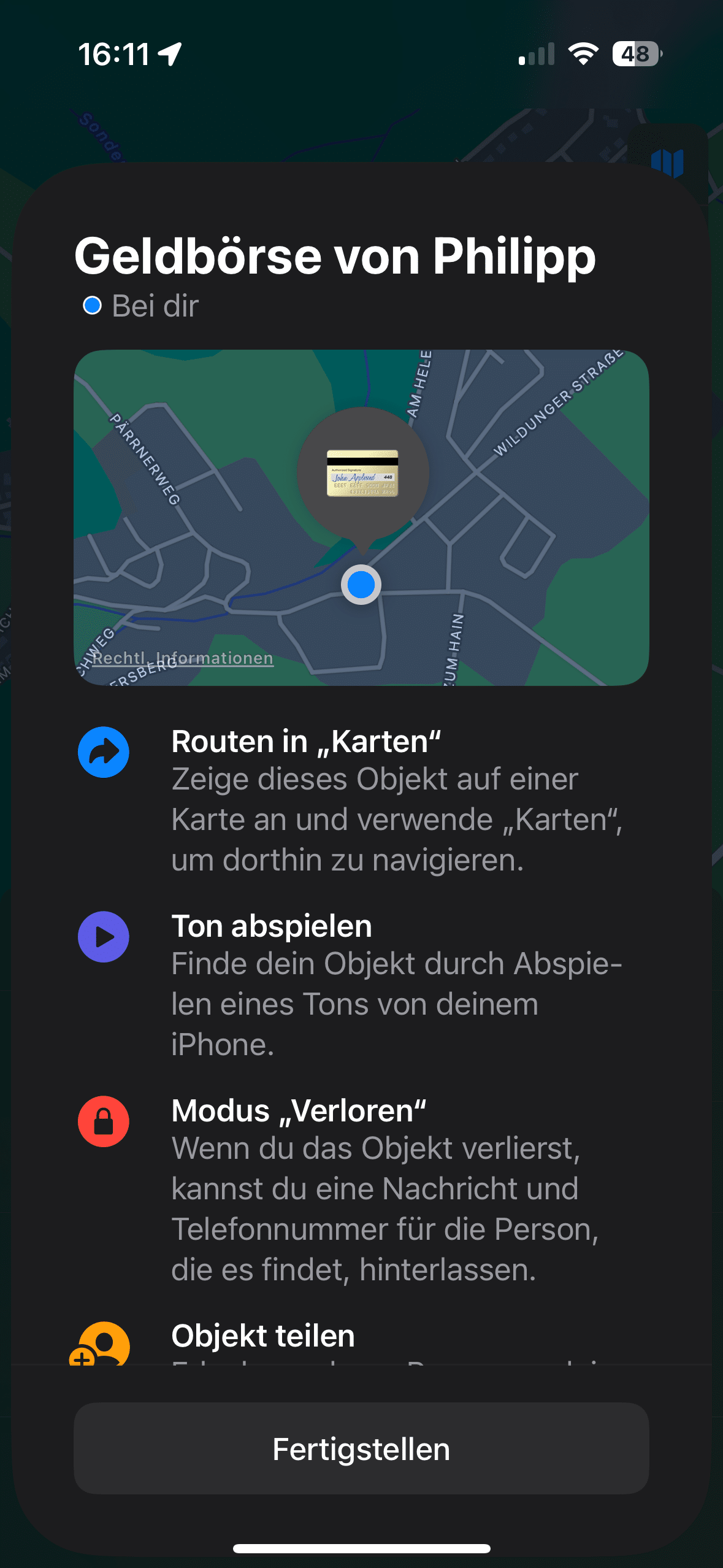 Kurz darauf wird die Wallet in der App auch sofort gefunden und kann verbunden werden. Der einzige Nachteil im Vergleich zu einem AirTag ist dabei der fehlende UWB-Chip. „Wo ist?“ zeigt also nur die ungefähre Position der Geldbörse an und führt nicht per Navigation zentimetergenau direkt zum Objekt.