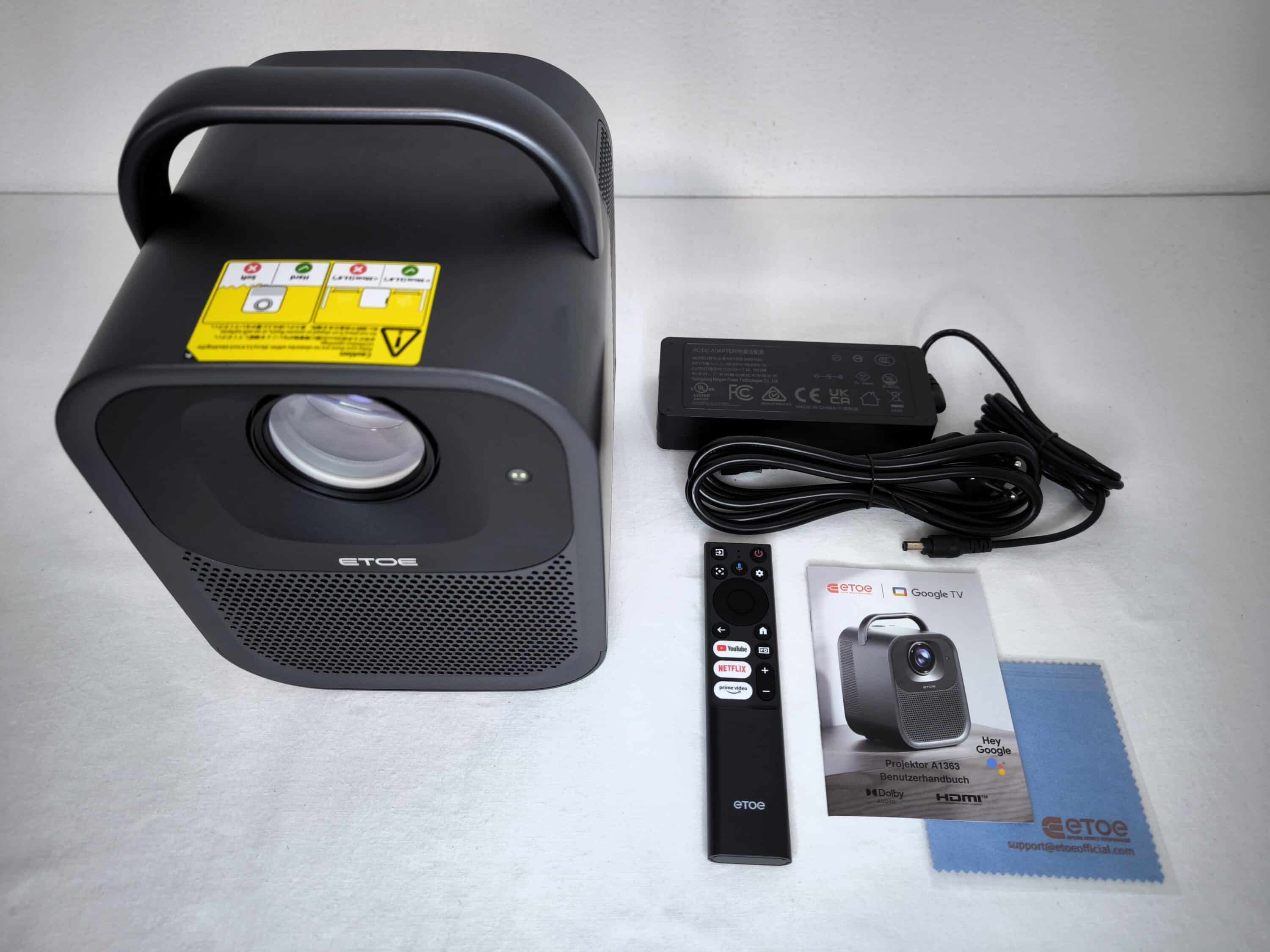 Der ETOE Seal Pro Beamer kommt gut verpackt daher. Zum Lieferumfang gehören neben dem Beamer selbst auch die dazugehörige Fernbedienung sowie das 180 Watt starke Netzteil. Die Bedienungsanleitung und ein Reinigungstuch für die Linse runden das Paket sinnvoll ab. Für den Betrieb der Fernbedienung sind zwei AAA-Batterien notwendig, welche nicht mitgeliefert werden.