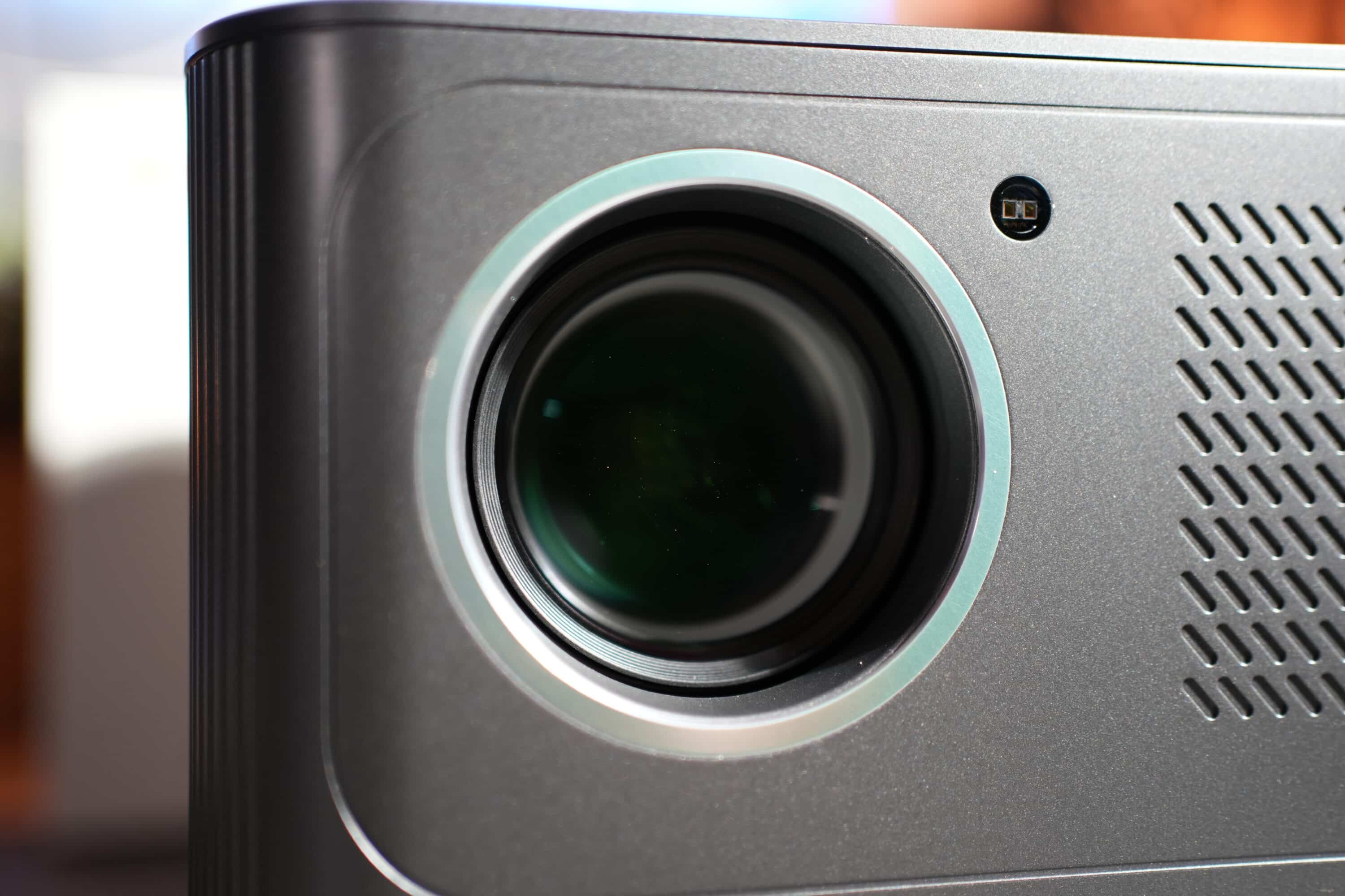 Die Belüftungsschlitze sind rundum verteilt, was nicht nur ein technisches Detail, sondern auch ein prägnantes Designelement darstellt. Zudem sorgt die saubere Verarbeitung dafür, dass der Beamer trotz seines voluminösen Auftritts einen hochwertigen Eindruck hinterlässt. Der unterseitige 1/4-Zoll-Gewindeanschluss ermöglicht die Montage auf Stativen oder speziellen Halterungen – eine praktische Option für Nutzer, die nicht nur eine feste Platzierung auf einem Tisch anstreben.