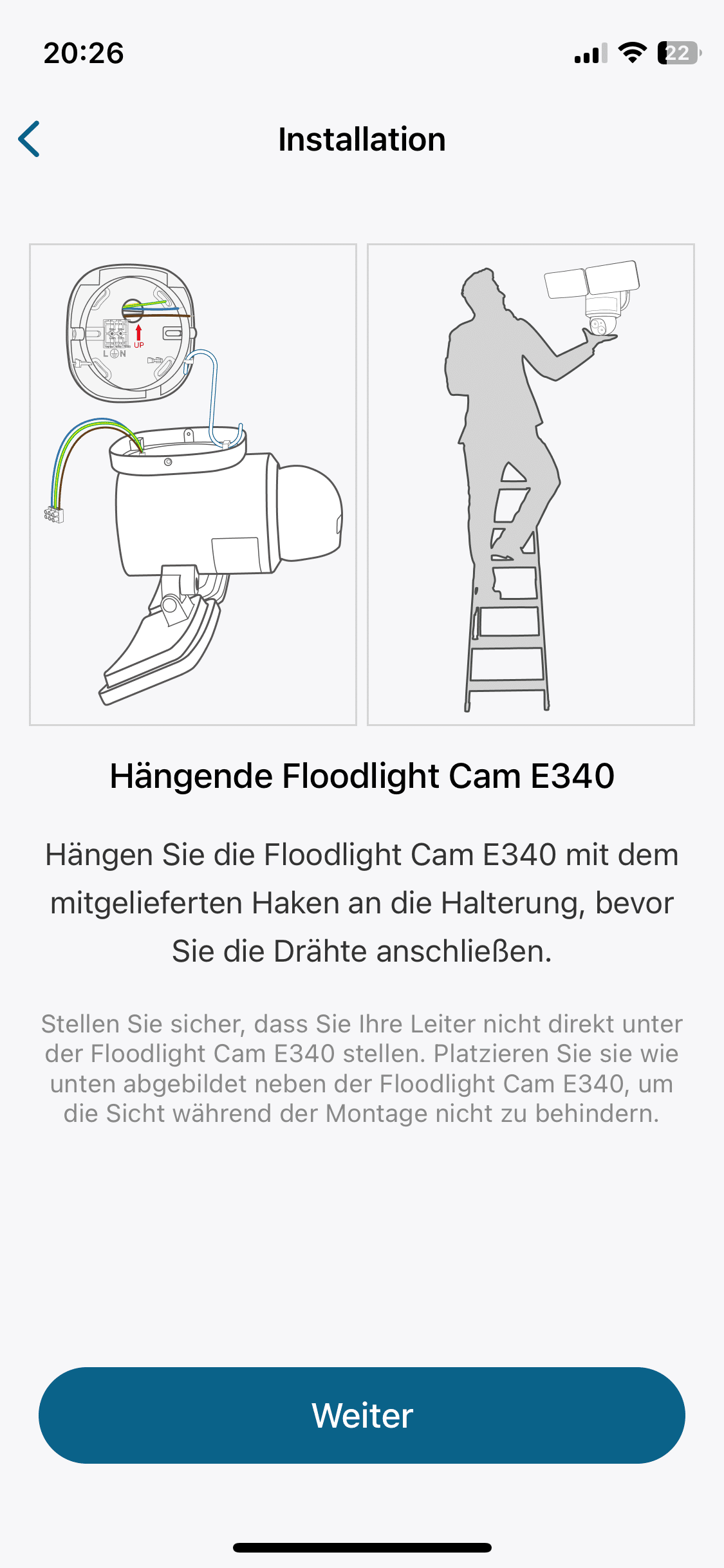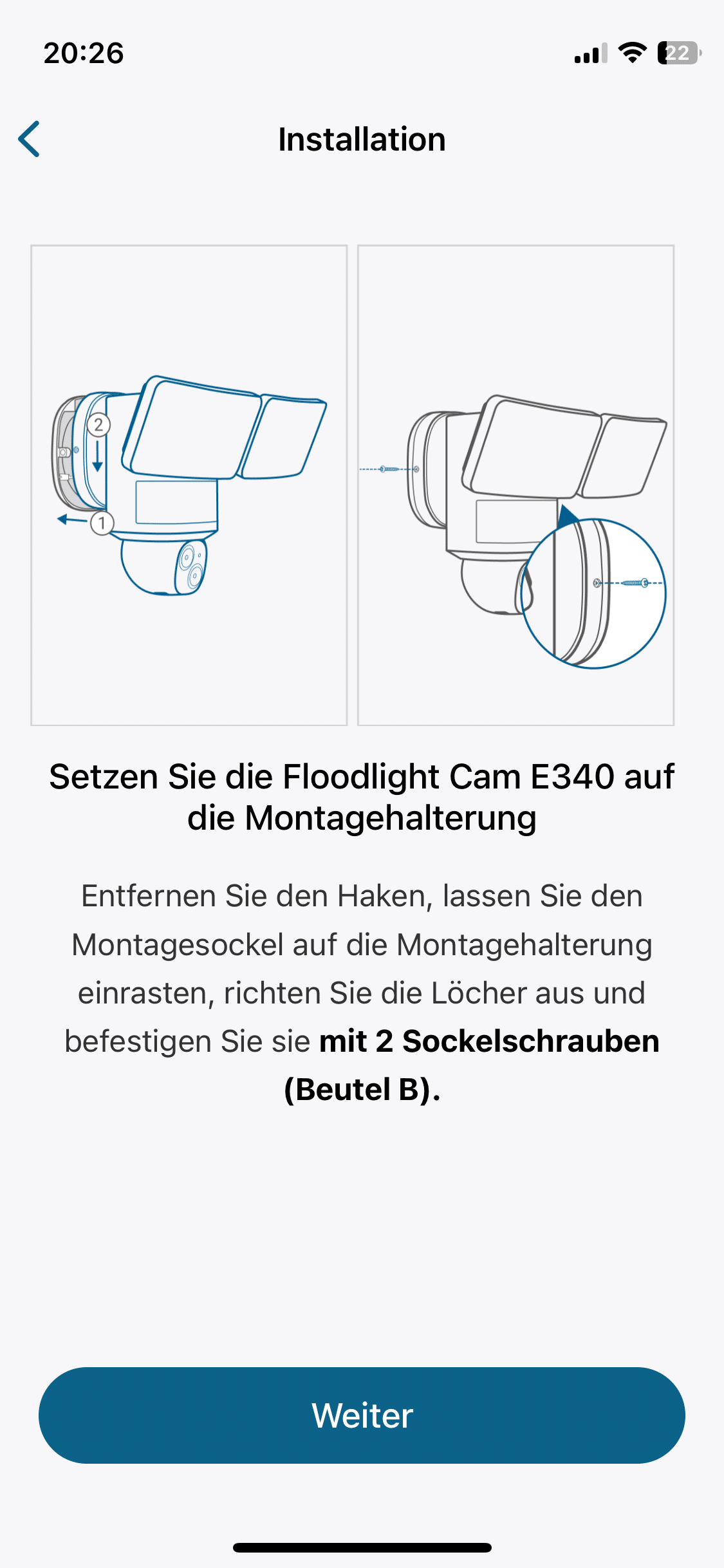 Die Floodlight E340 benötigt zwingend eine Stromverbindung. Einen Akku bekommst du hier nicht geboten. Wer auf diese Flexibilität nicht verzichten möchte, sollte sich lieber die Eufy S330 (Test) oder SoloCam S340 (Test) ansehen. Hast du schon einmal eine Lampe angeschlossen und einen Bohrer in den Händen gehalten, ist die Montage der Kamera allerdings kein Problem.