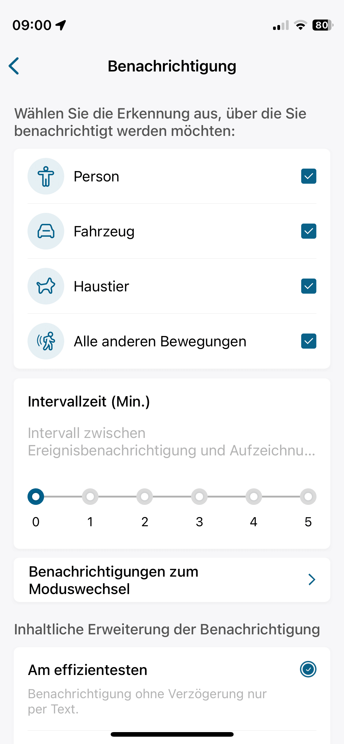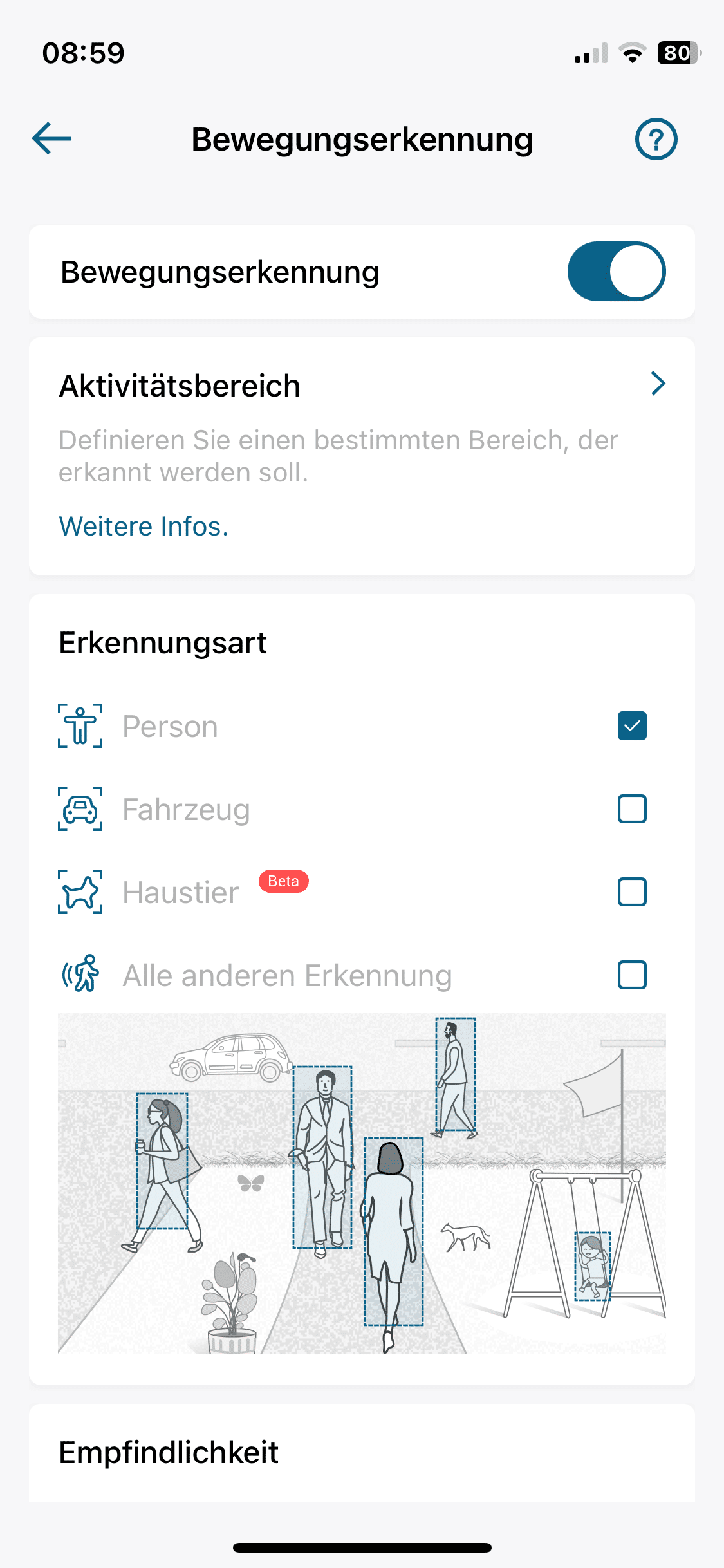 Alternativ kannst du auch die Reichweite des entsprechenden Sensors herunterschrauben. Dieser erkennt Bewegungen auf bis zu 12 Meter Distanz und lässt sich fünfstufig anpassen. Auch eine Filterung bestimmter Bewegungen ist möglich, da die Kamera zwischen Haustieren, Menschen und Fahrzeugen unterscheiden kann.