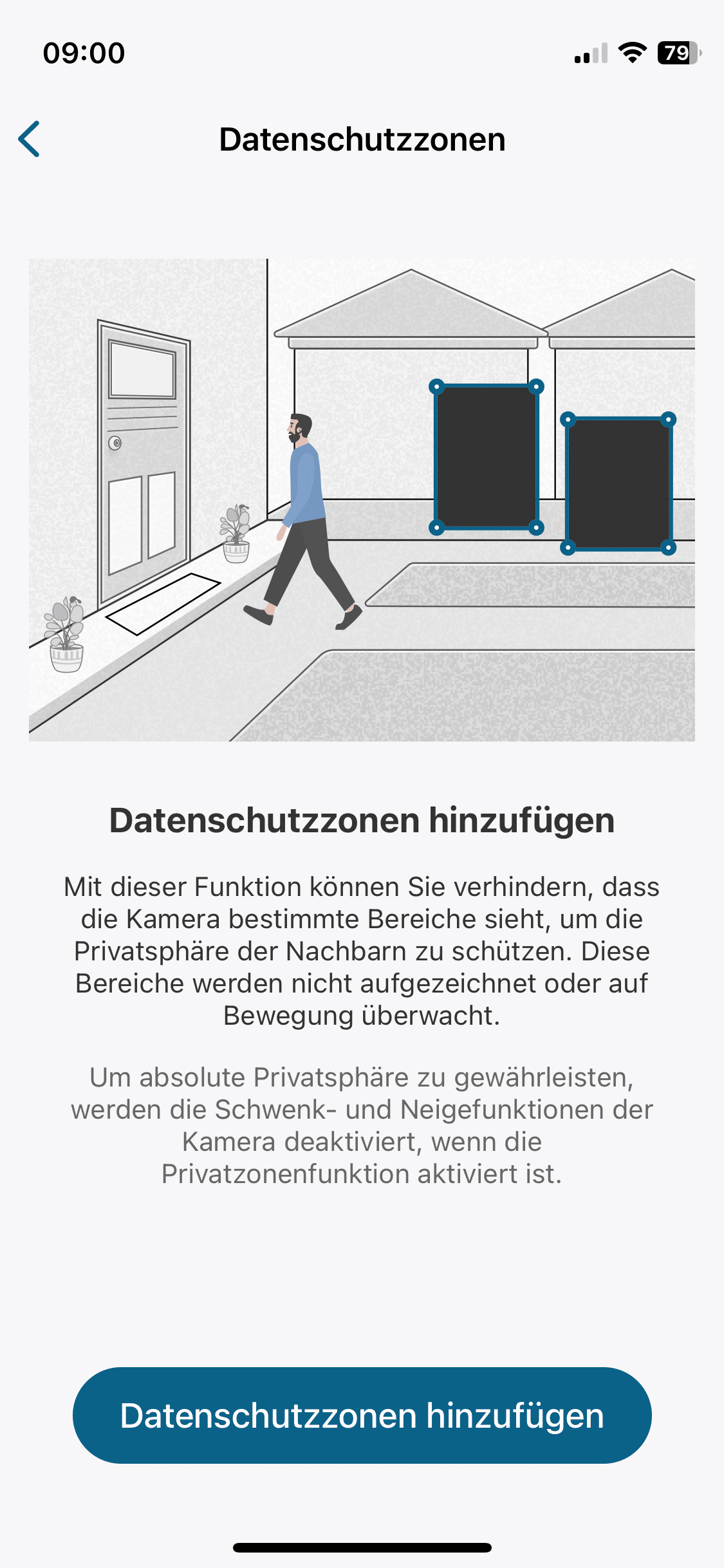 Was du als erstes tun solltest, ist die Einstellung des Sichtfeldes der Kamera. Sollte sie auf den öffentlichen Raum oder auf ein Nachbargrundstück zeigen, musst du diese Bereiche ausblenden. Im Endergebnis schwärzt die Kamera den von dir ausgewählten Bereich, was einen Betrieb im Sinne der Datenschutzgrundverordnung (DSGVO) ermöglicht.