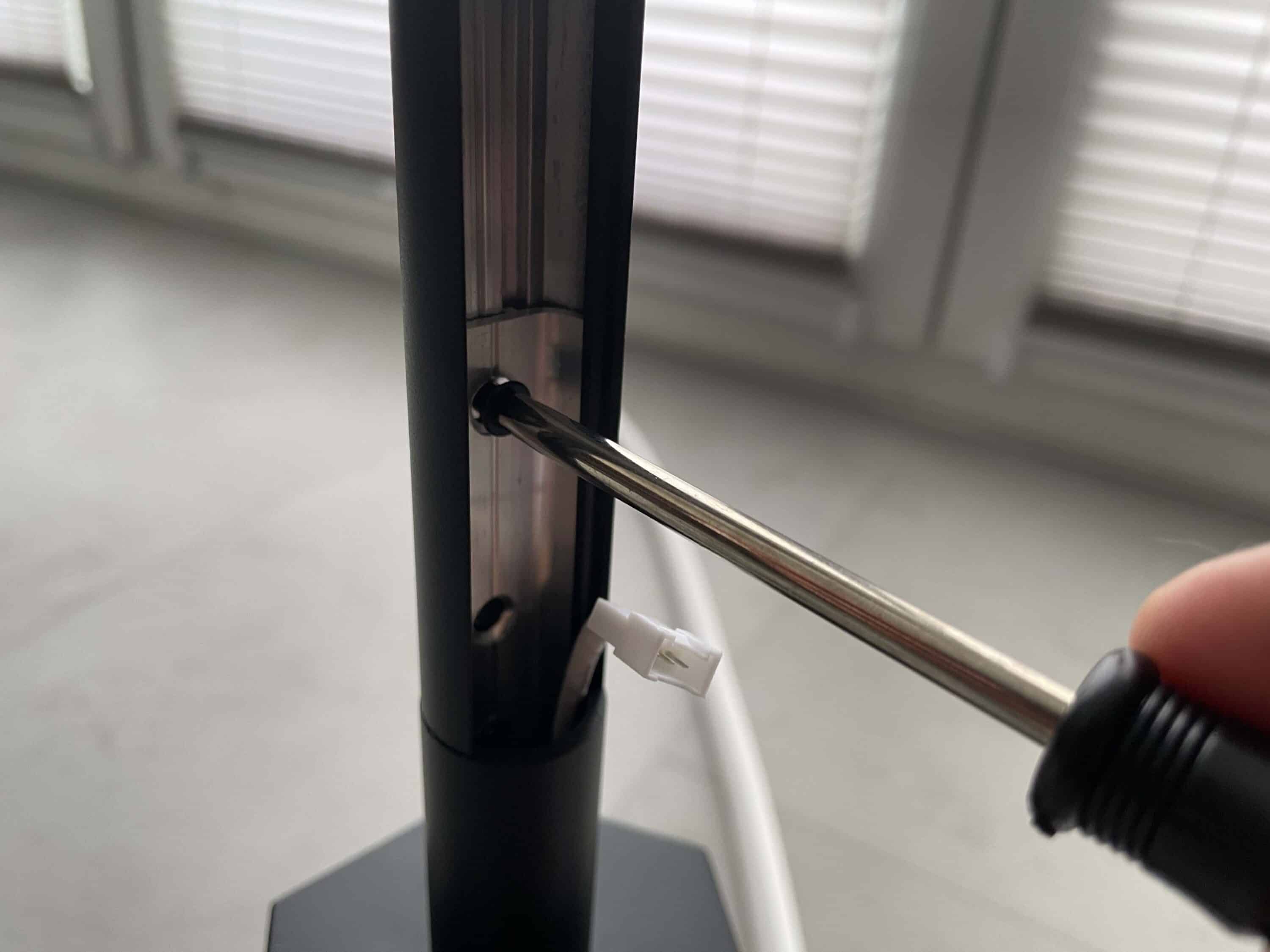 Wenn man den Bausatz vor sich liegen hat, steht bereits fest, dass der Aufbau nicht komplex ist. Insgesamt liefert Anker die eufy Indoor Floor Lamp E10 in fünf Teilen aus. Zunächst nimmt man den Standfuß heran. Hier werden nun die drei Verlängerungsstäbe montiert. Richtig cool: Das notwendige Werkzeug liegt dem Lieferumfang bereits bei. Euer Werkzeugkoffer kann also geschlossen bleiben.