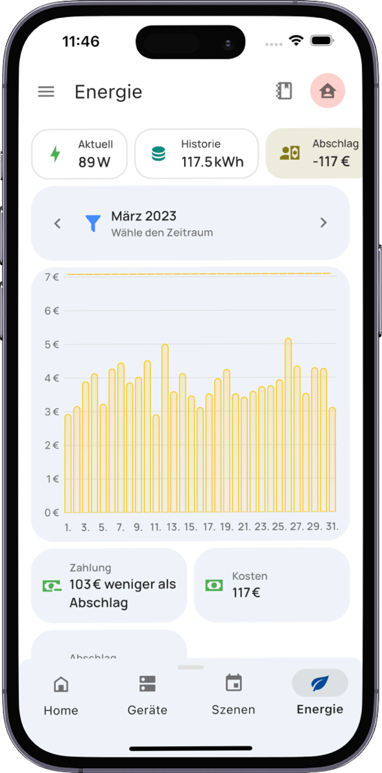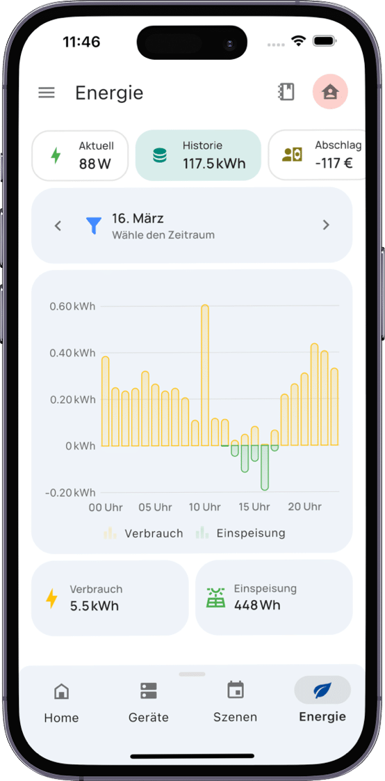 Die App bietet dank ihres übersichtlichen Designs einen hohen Nutzerkomfort. So bekommst du bereits auf der Startseite die wichtigsten Informationen zu deinem Stromverbrauch angezeigt. Hierzu gehören neben aktuellem Stromverbrauch auch der Monatsverbrauch sowie der Zählerstand. Für Besitzer einer PV-Anlage oder eines Balkonkraftwerks ist auch der Parameter der Einspeisung interessant. Tippst du auf eine der Daten, bekommst du detaillierte Informationen. Das birgt nicht nur ein großes Sparpotential, welches du vor allem durch Hinterlegen deines Stromtarifs gezielt herausarbeiten kannst.