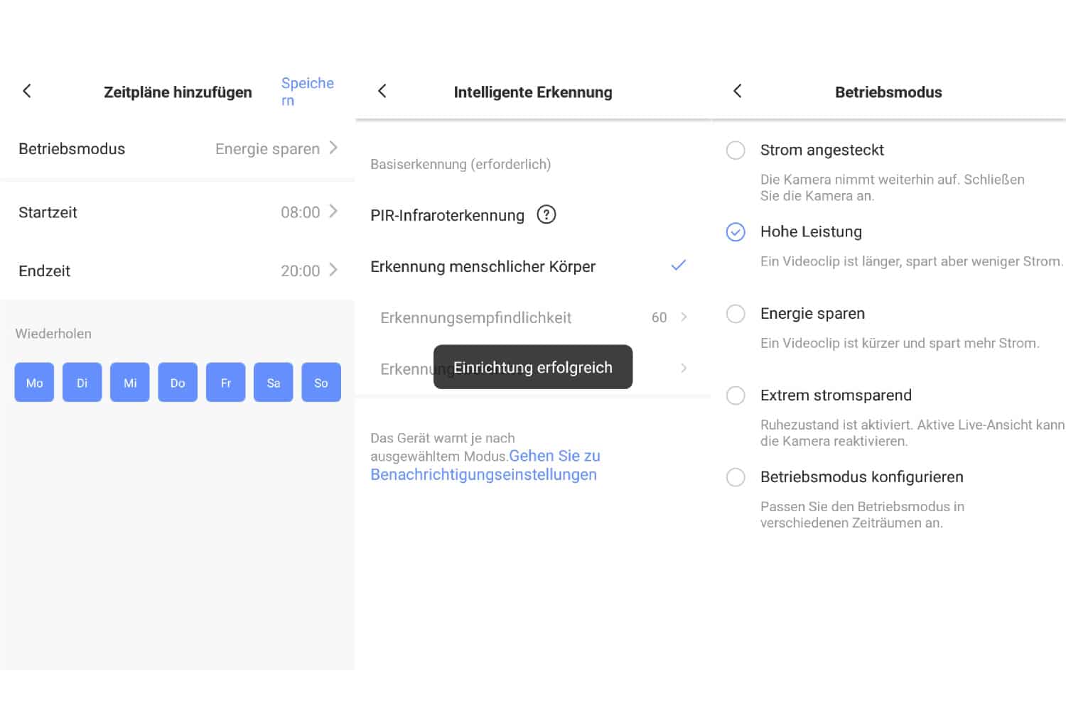 Ob die CB3 bei Erkennung automatisch Videos aufzeichnet, hängt vom eingestellten Betriebsmodus ab. In den Modi Hohe Leistung und Energie sparen ist dies der Fall, nur die Länge der Videos variiert hier. Die Länge von automatisch aufgezeichneten Videos kann andernfalls nicht gesteuert werden. Möchte man die Kamera in den Ruhezustand versetzen, in dem nur die Live-Ansicht zugänglich ist, nutzt man den Betriebsmodus Extrem stromsparend. Es können auch Zeitpläne für die Betriebsmodi angelegt werden.