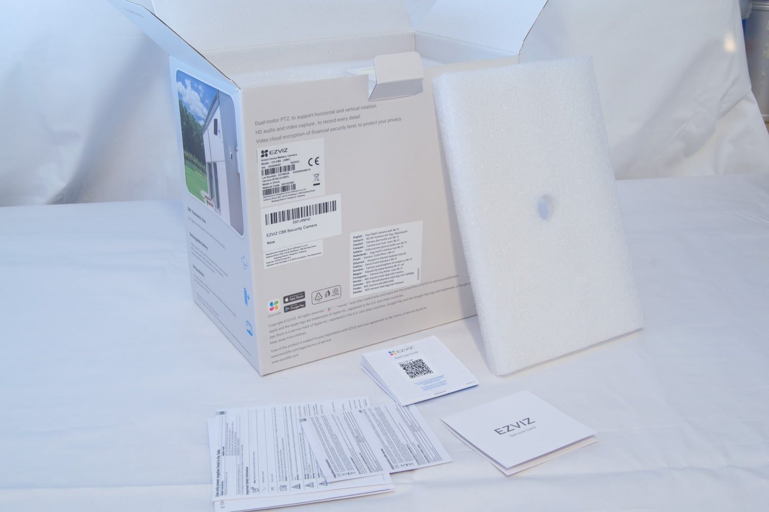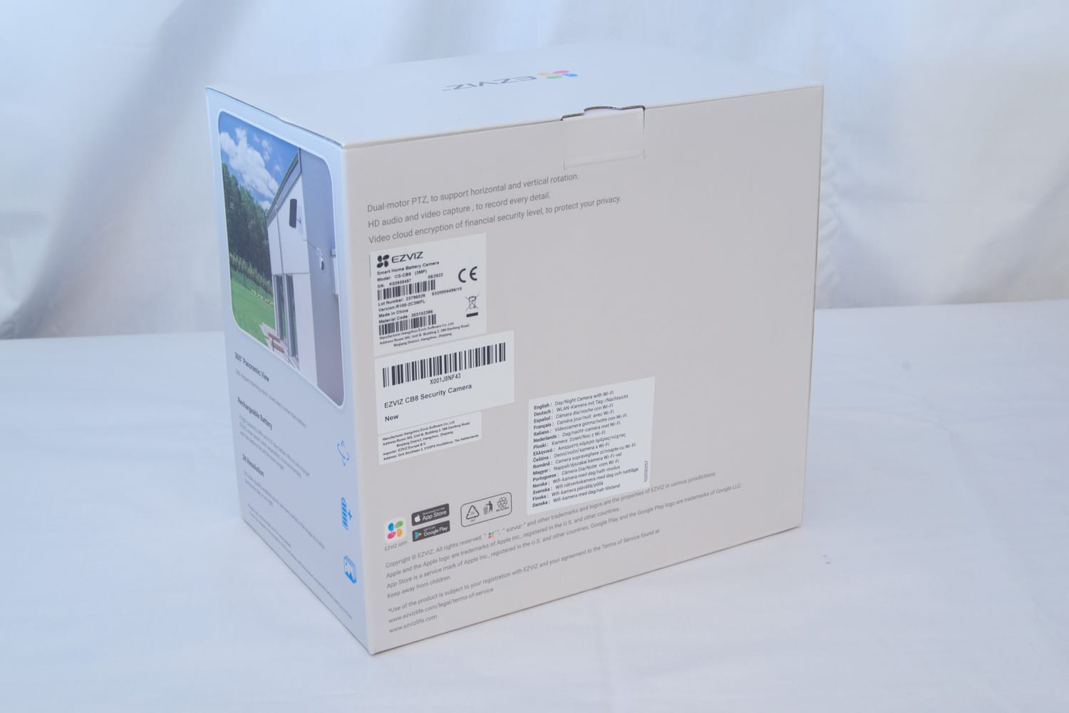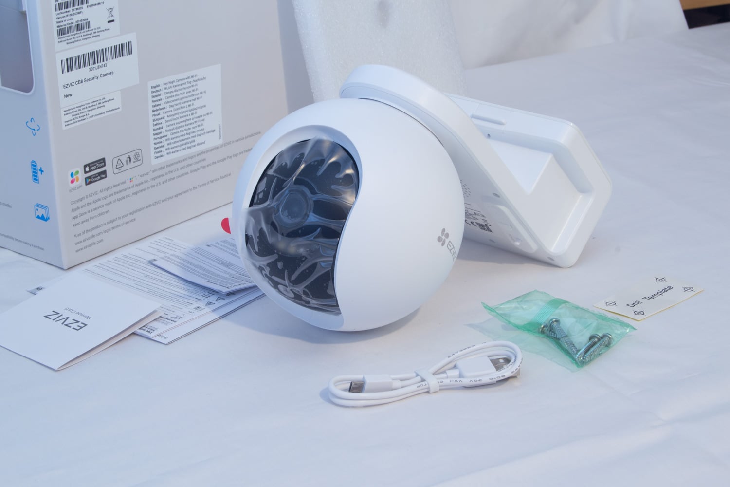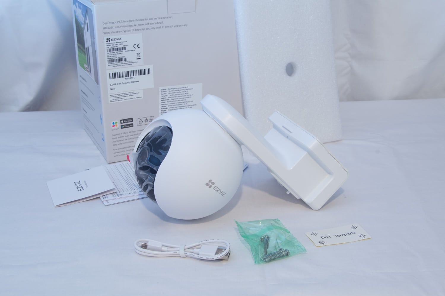 Das Design der EZVIZ CB8 ähnelt dem gängigen Aufbau für schwenkbare Überwachungskameras für den Außenbereich, welche üblicherweise an Hauswänden befestigt werden. Die Kamera ist vertikal beweglich in einem kugelförmigen Gehäuse untergebracht, welches wiederum horizontal beweglich an einem länglichen Arm befestigt ist.