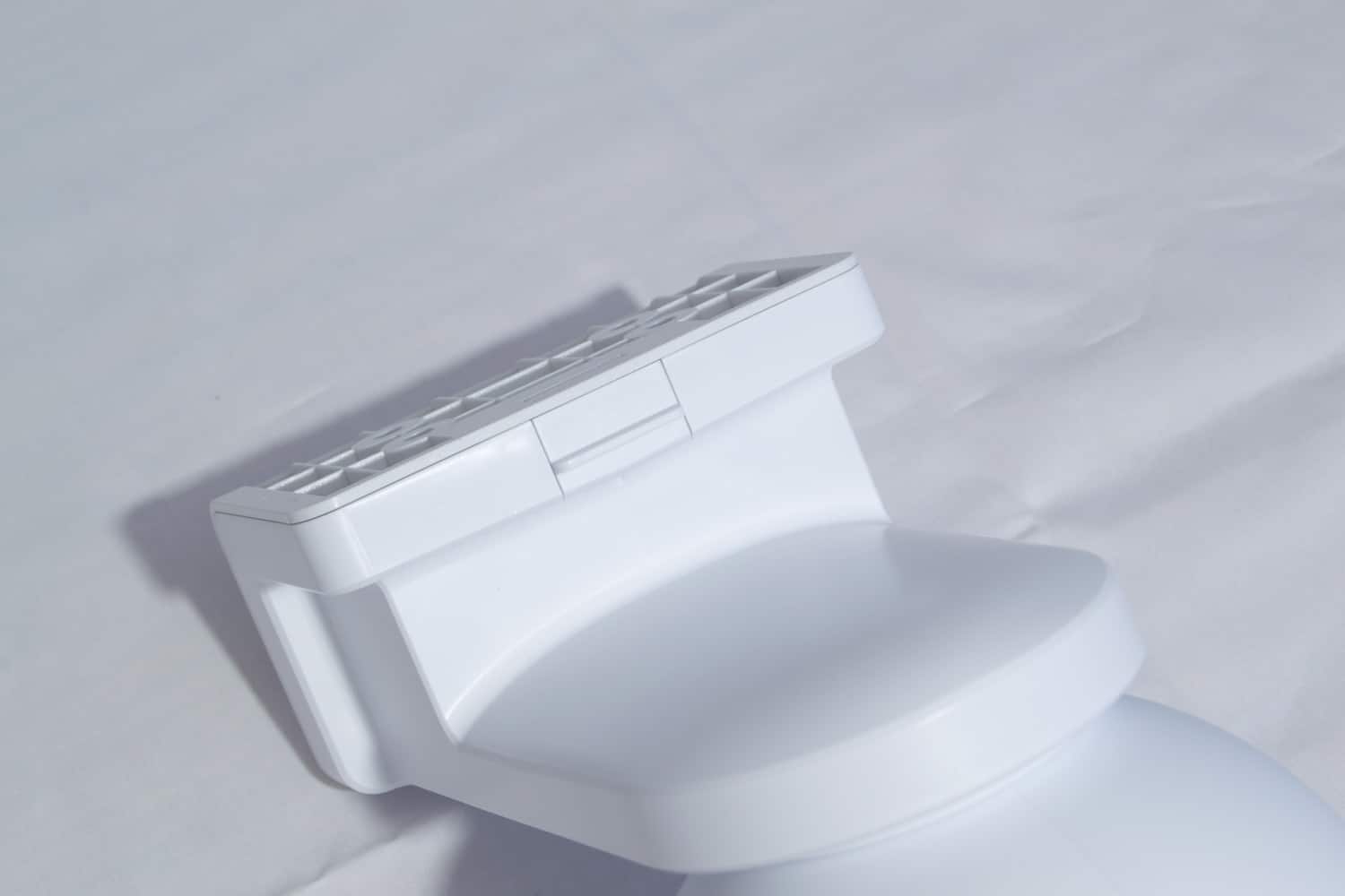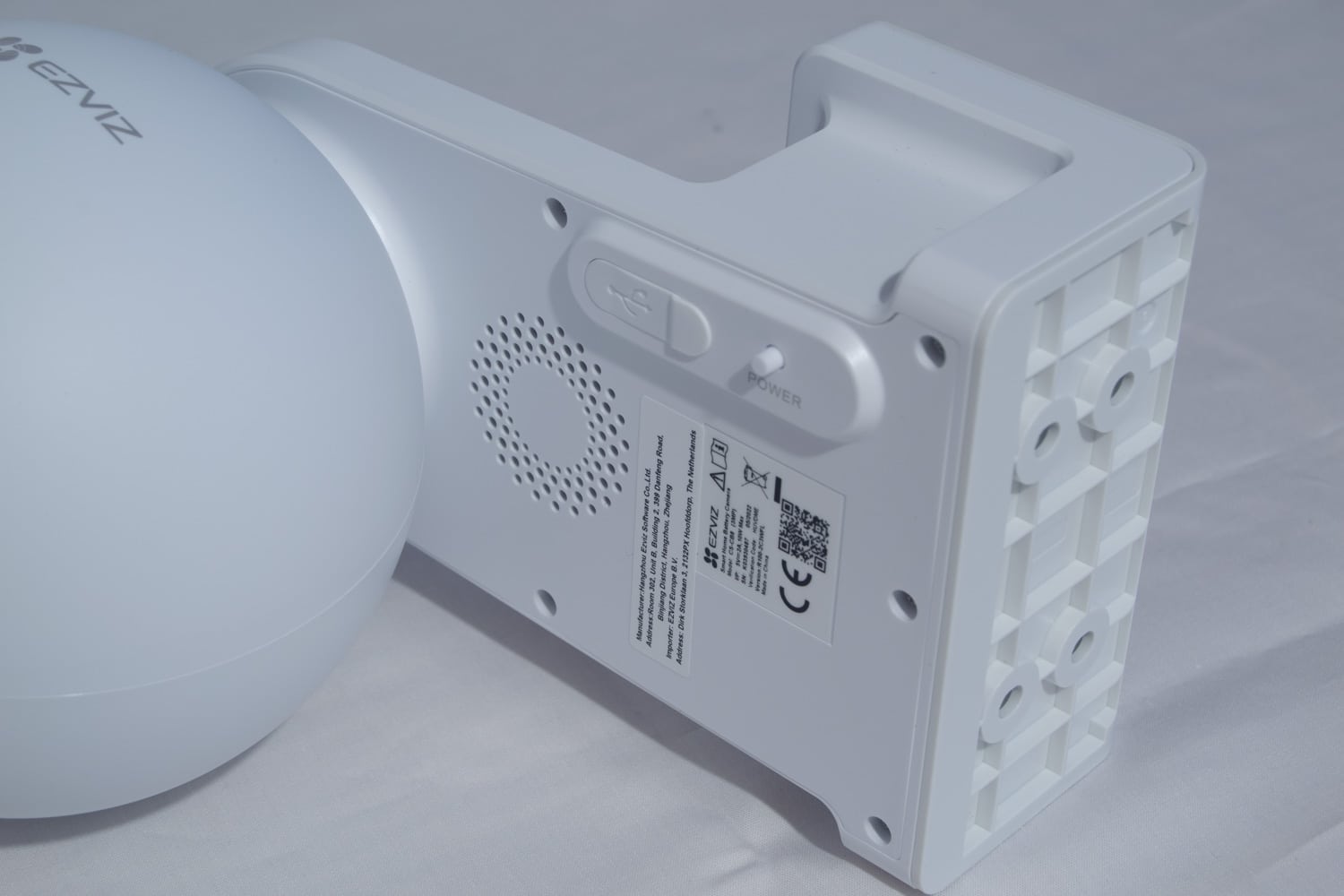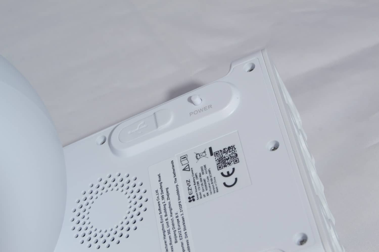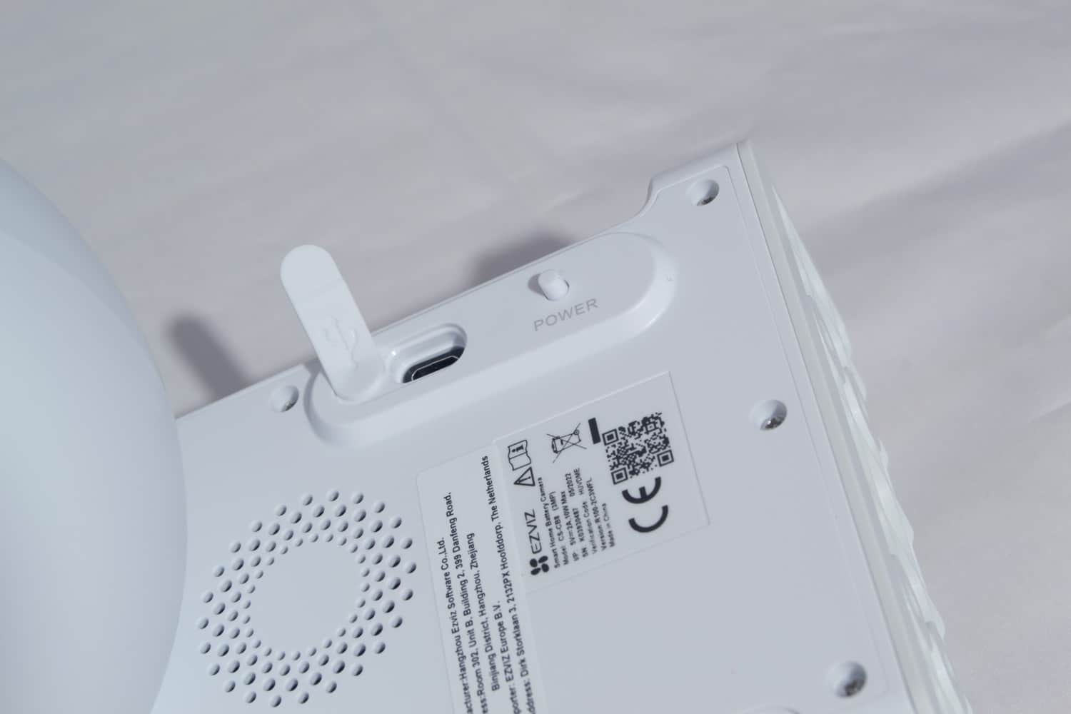Die Ein-/Aus-Taste und der Micro-USB-Anschluss der Kamera, sowie auch der Lautsprecher, befinden sich auf der Unterseite des Kamera-Arms, also auf der wetterabgewandten Seite. Sowohl die Blende des USB-Anschlusses, welcher als Stromanschluss fungiert, als auch die Ein-/Aus-Taste der Kamera sind gummiert, daher also mutmaßlich spritzwassergeschützt.