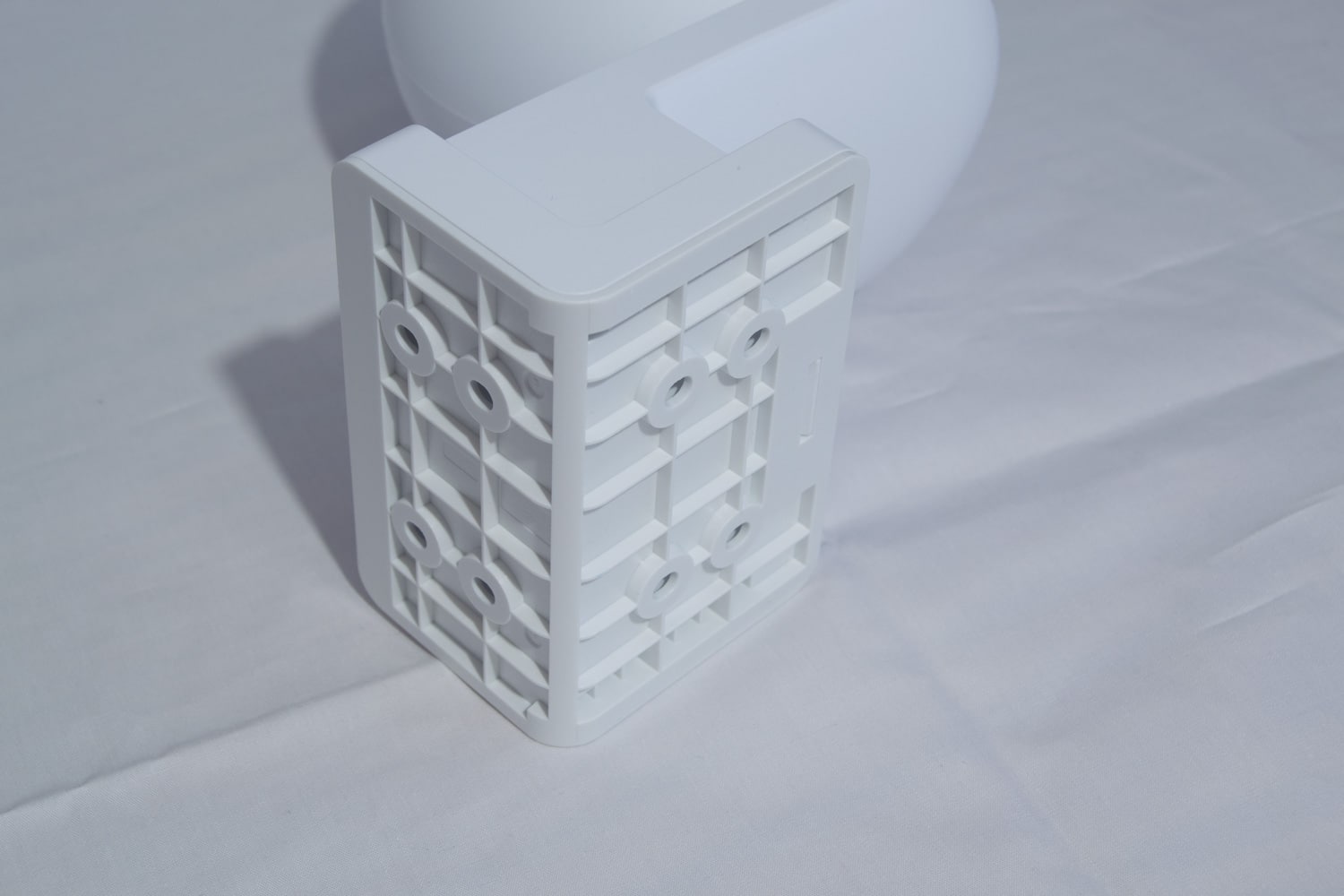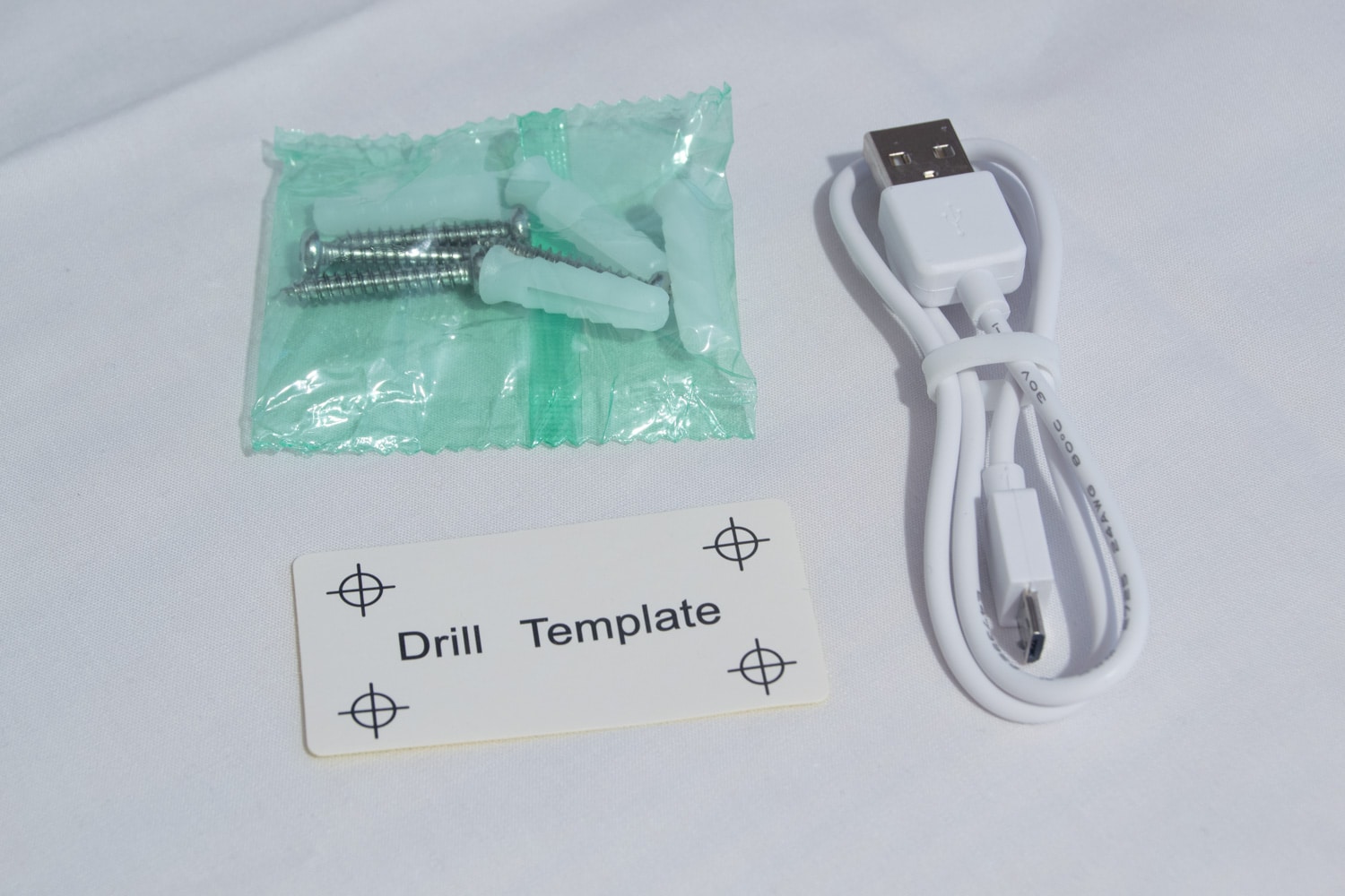Die Anbringung des Montagefußes an einer Hauswand ist dank der vier mitgelieferten Schrauben relativ simpel. Um die 4 nötigen Bohrungen zu erleichtern, liegt der Verpackung eine Bohrschablone bei. Für Untergründe wie Zement und Putz sind ebenfalls Dübel enthalten. Der Montagefuß kann auch von der Decke hängend montiert werden. Für beide Szenarien liegt der Verpackung jeweils eine Kurzanleitung bei.