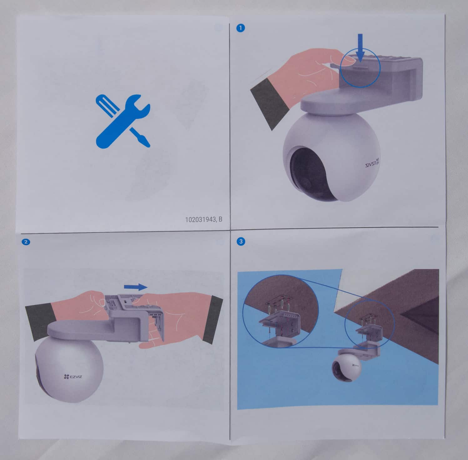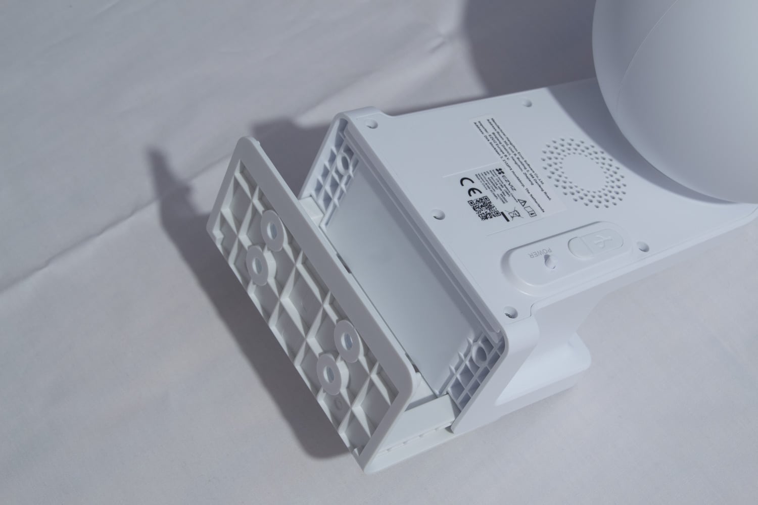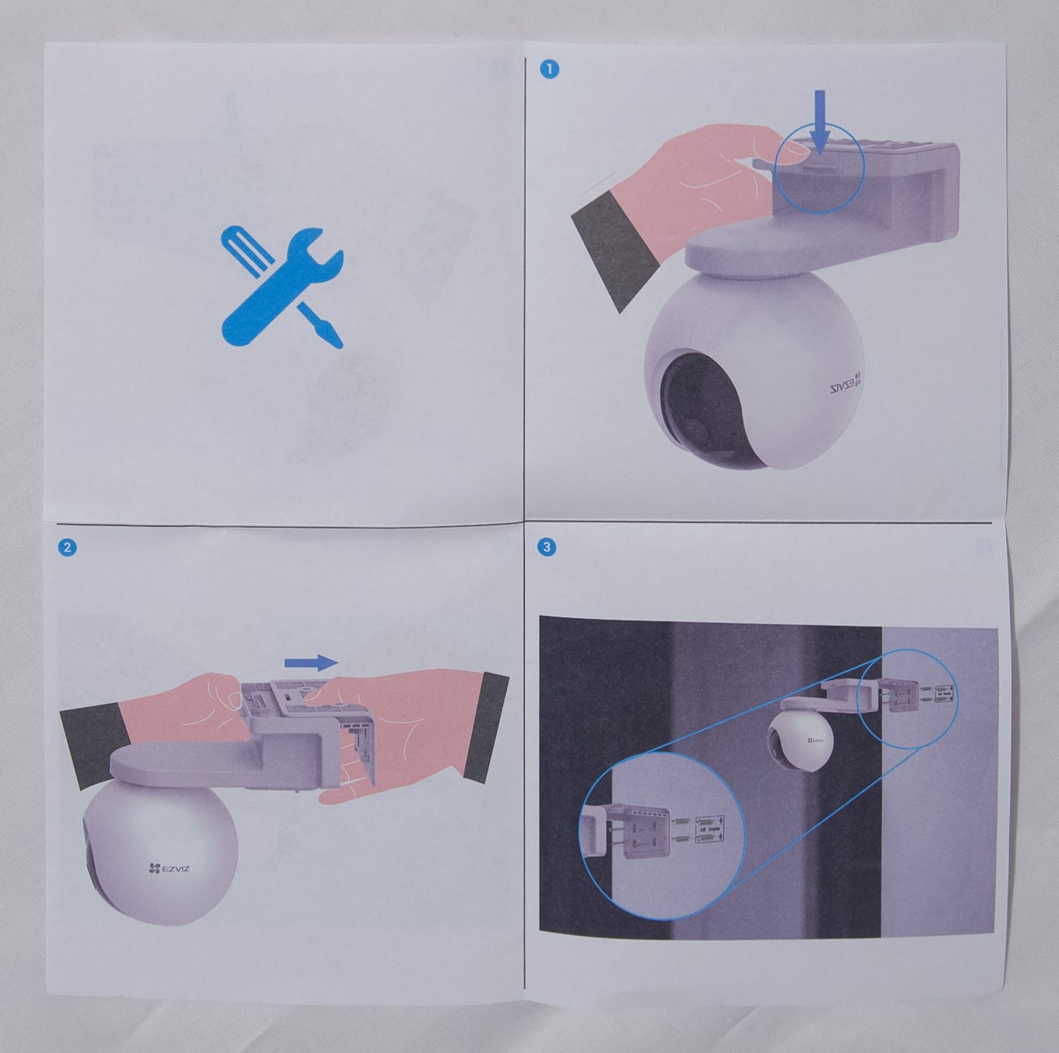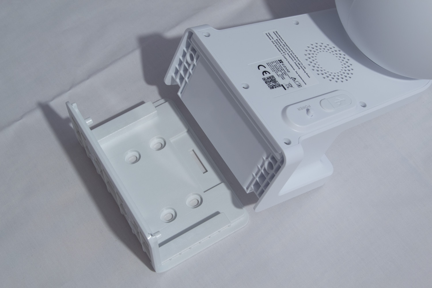 Der Kamera-Arm wird in in den Montagefuß geschoben und rastet dort mechanisch ein. Er kann mit einem Federdruckhebel vom Montagefuß gelöst werden, etwa um die Kamera aufzuladen oder die Micro-SD-Karte zu wechseln. Streng genommen erleichtert diese einfache Ablösung der Kamera von ihrem Standort auch ihren Diebstahl, sie sollte also in ausreichender Höhe angebracht werden, im Handbuch werden 3 Meter empfohlen.