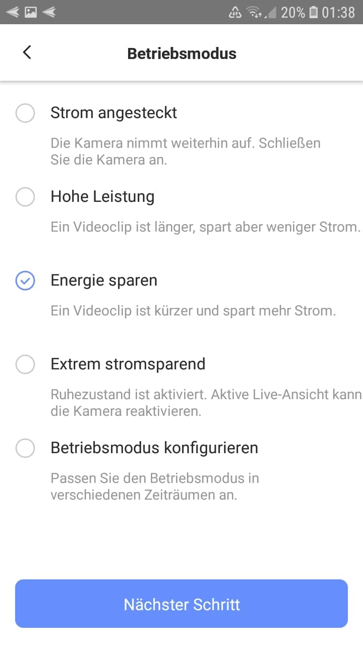 Der Betriebsmodus der Kamera bestimmt in welcher Länge (Energie sparen/Hohe Leistung) oder ob überhaupt Videos aufgezeichnet werden sollen (Extrem stromsparend). Wir nutzen die Standardeinstellung „Energie sparen“, was die Videolänge verkürzt und dadurch Energie einspart.
