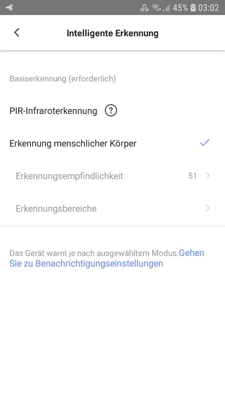 Die CB8 bietet zwei intelligente Methoden zur Erkennung: die „PIR Infraroterkennung“ und die „Erkennung menschlicher Körper“. Immer aktiviert ist zudem die Basiserkennung, welche allerdings nicht näher beschrieben wird. Es ist immer eine der beiden intelligenten Methoden aktiv und welche von beiden wir nutzten, hat zumindest in unserem Test erfreulicherweise keine Rolle gespielt. Die Erkennung unserer Bewegung oder Anwesenheit funktionierte insgesamt sehr zuverlässig, auch bei Dunkelheit.