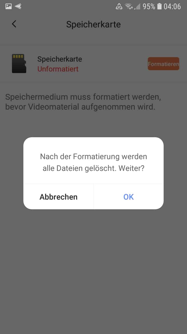 Unsere 64 GB Micro-SD-Karte setzen wir noch während des Betriebs ein, starten die App dann aber neu, da die Karte sonst noch nicht als erkannt angezeigt wird. Die Karte muss vor der ersten Benutzung zunächst über die Geräte-Einstellungen in der App formatiert werden.