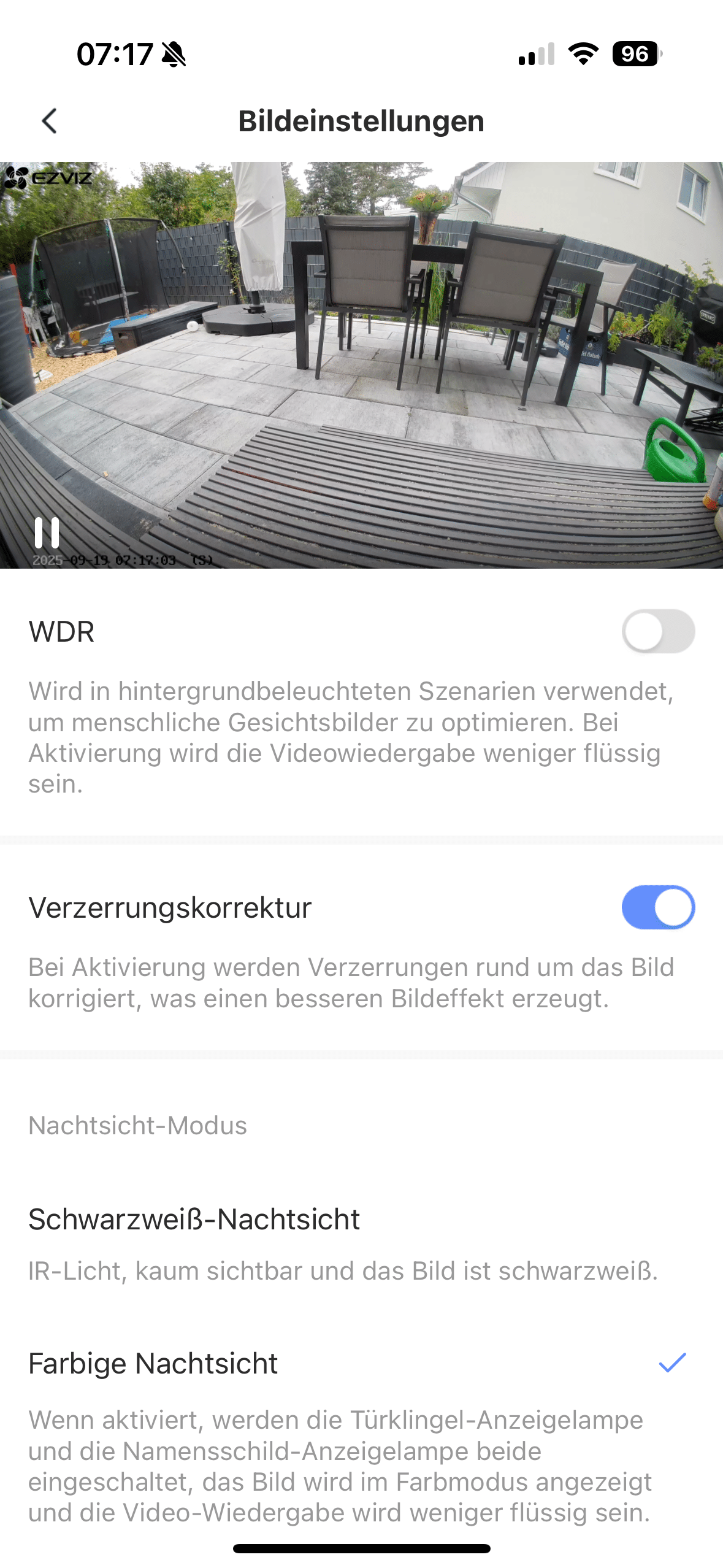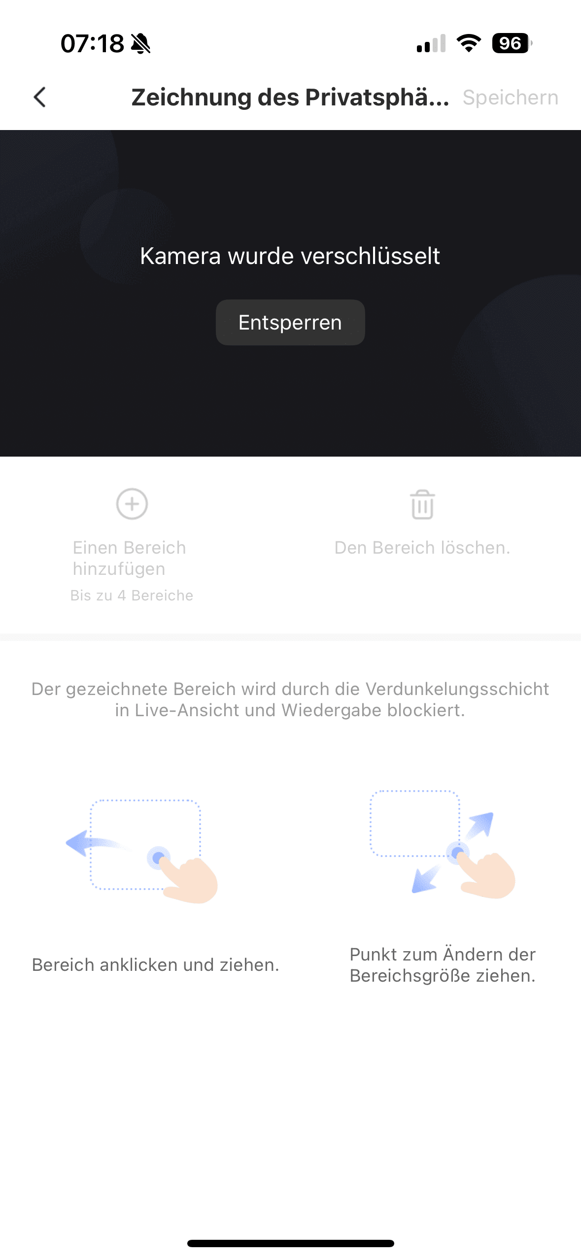 In der App lassen sich zahlreiche Einstellungen anpassen. Als erster Schritt empfiehlt es sich, den Sichtbereich der Kamera zu konfigurieren. Da der Blickwinkel sehr weit ist, kann es leicht passieren, dass Bereiche der Straße oder sogar Nachbargrundstücke erfasst werden. Um möglichen Problemen vorzubeugen, sollte man daher sogenannte „blinde Zonen“ festlegen, die von der Kamera nicht aufgezeichnet werden.
