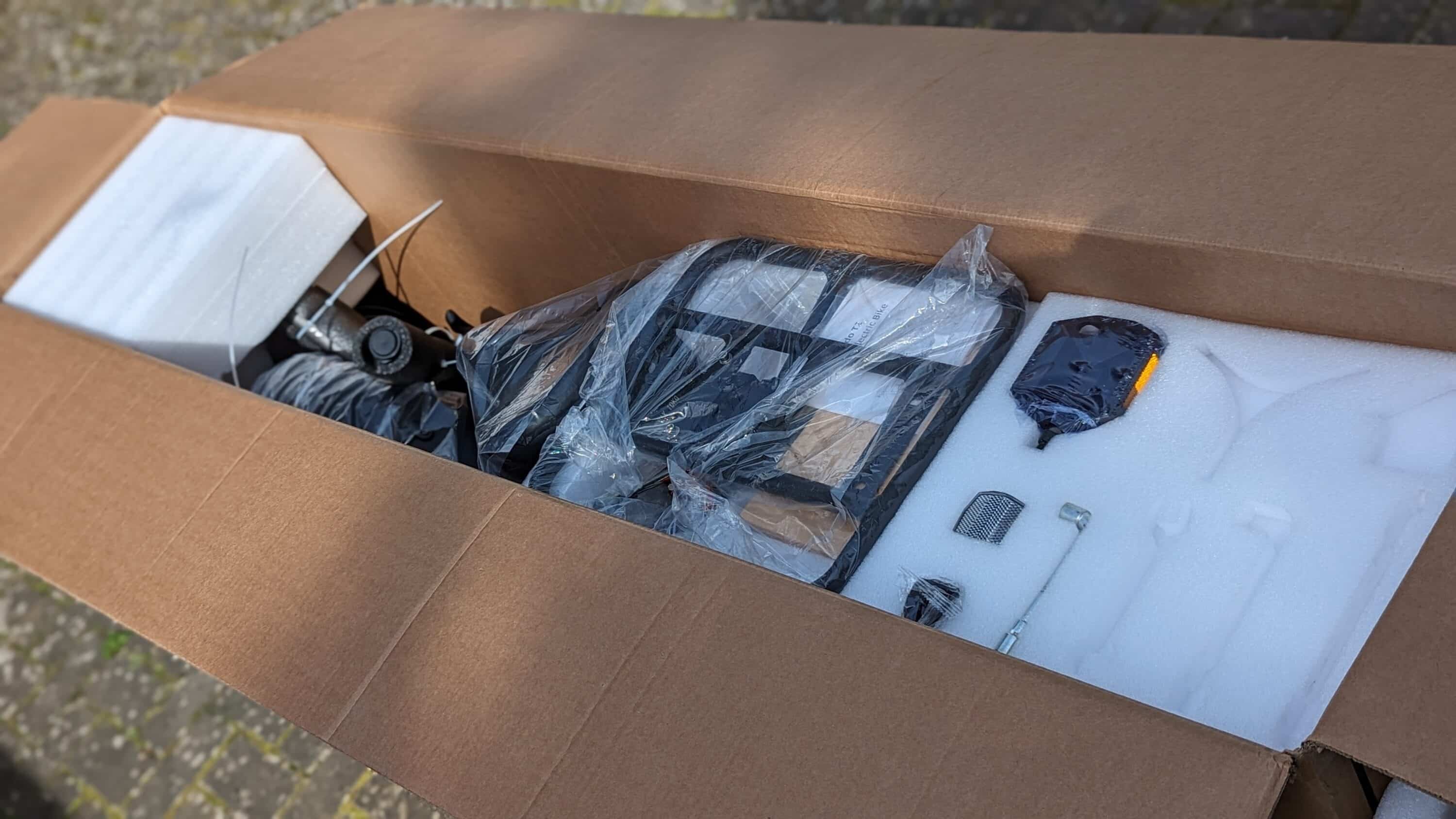 Wie immer bei Fiido, kommt auch das T2 fast vollständig montiert in einem großen Karton daher und sicher in Styropor verpackt bei dir zu Hause an. Sämtliche Bestandteile sind zudem noch einmal einzeln verpackt und durch Kabelbinder gesichert, sodass hier auch die ruppigste Reise keine Schäden verursachen kann.