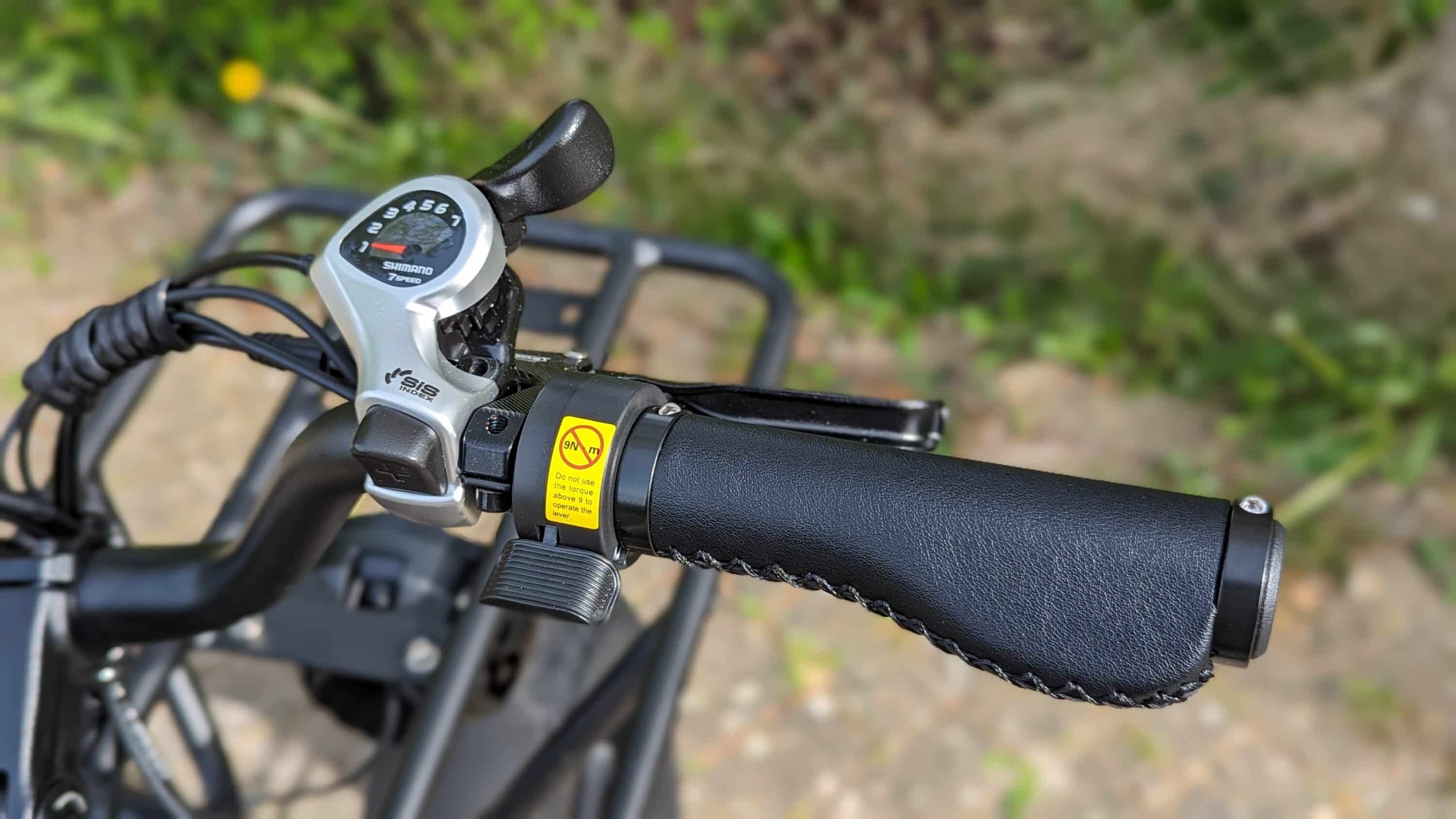 Die höchste Beschleunigung darfst du aufgrund des hohen Eigengewichtes natürlich nicht erwartet, dennoch meistert der leistungsstarke Motor auch unwegsames Gelände und Steigungen problemlos. Eine Shimano 7 speed-Kettenschaltung mit fünf Betriebsmodi wird ebenfalls geboten, sie wird über den rechten Lenker betrieben, während sich dort zudem der leider nicht zulässige Gashebel finden lässt.