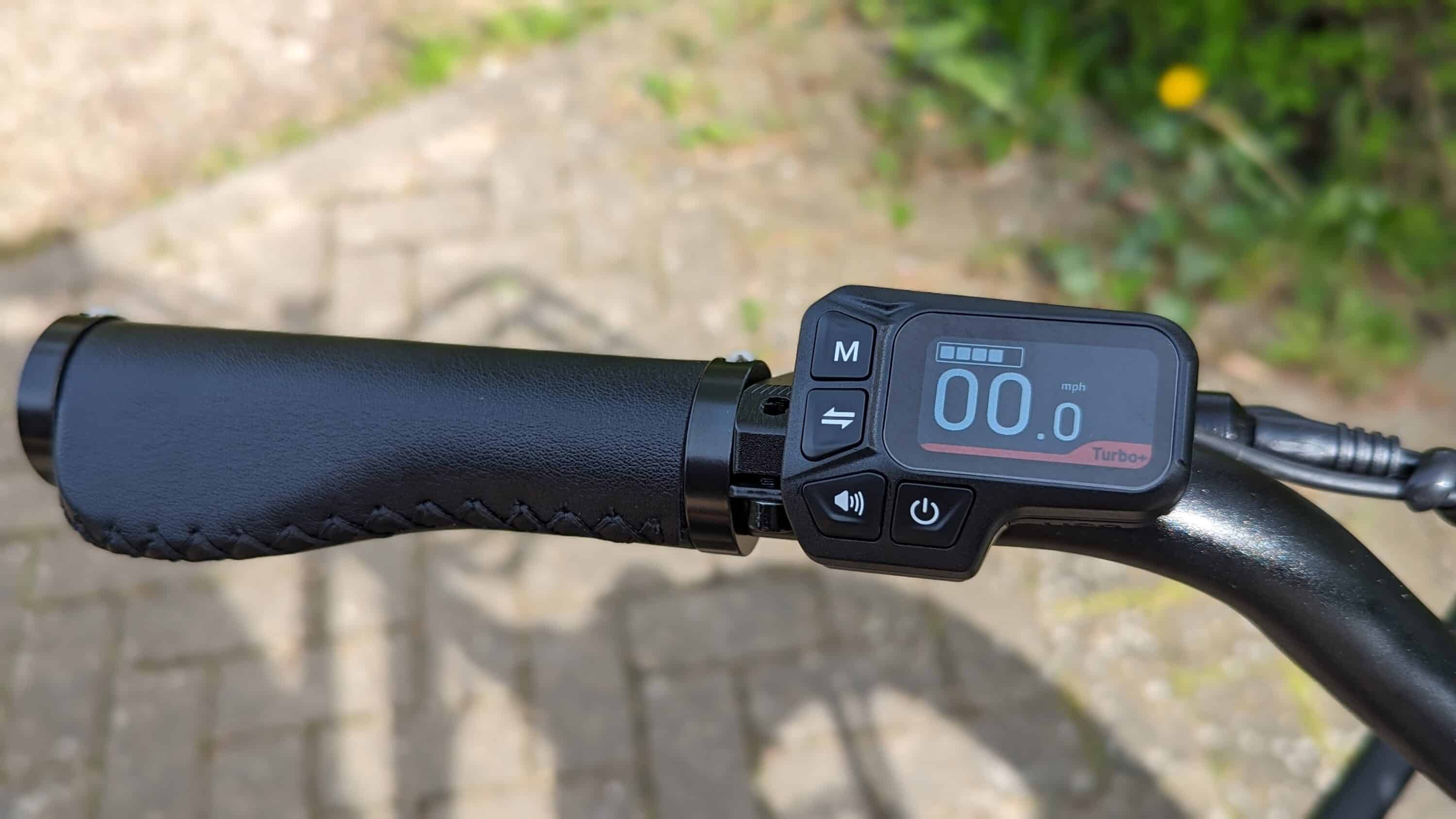 Auf der linken Seite hingegen finden wir das smarte LC-Display, das beispielsweise über Geschwindigkeit und Akkukapazität informiert. Dort findet sich zudem ein Knopf für die Hupe, die ebenfalls nicht StVZO-konform ist, aber auch einfach durch eine handelsübliche Klingel ersetzt werden kann.