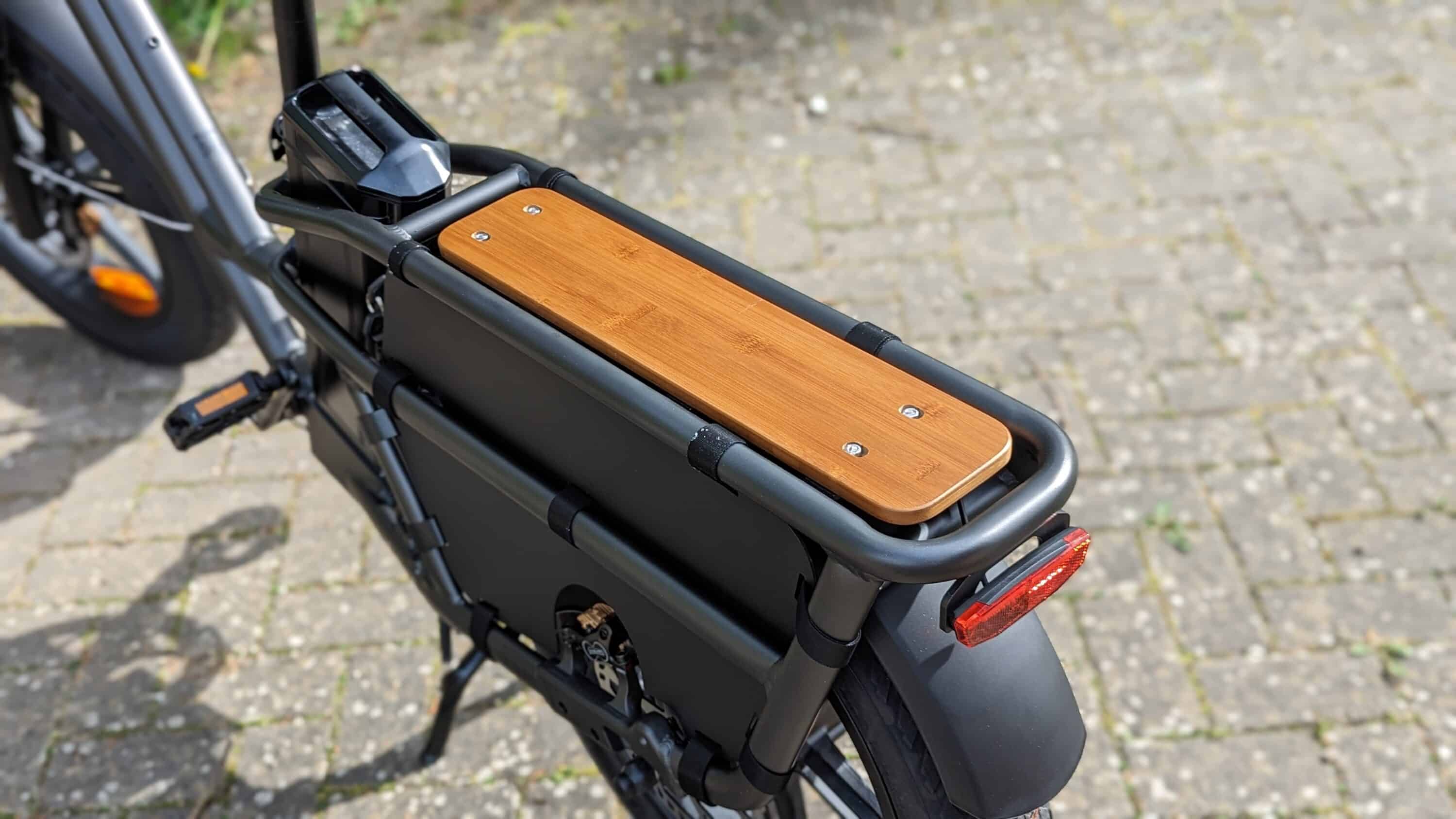 Der hintere Gepäckträger setzt mit seiner Holz-Optik einen angenehmen Designakzent zum ansonsten dunkelgrauen Rahmen. Auch die mit Kunstleder überzogenen Griffe am Lenker und die Bremsen in Carbon-Optik sehen äußerst gut aus, was man von den etwas unsauberen Schweißnahten auf dem gesamten Bike jedoch nicht behaupten kann.
