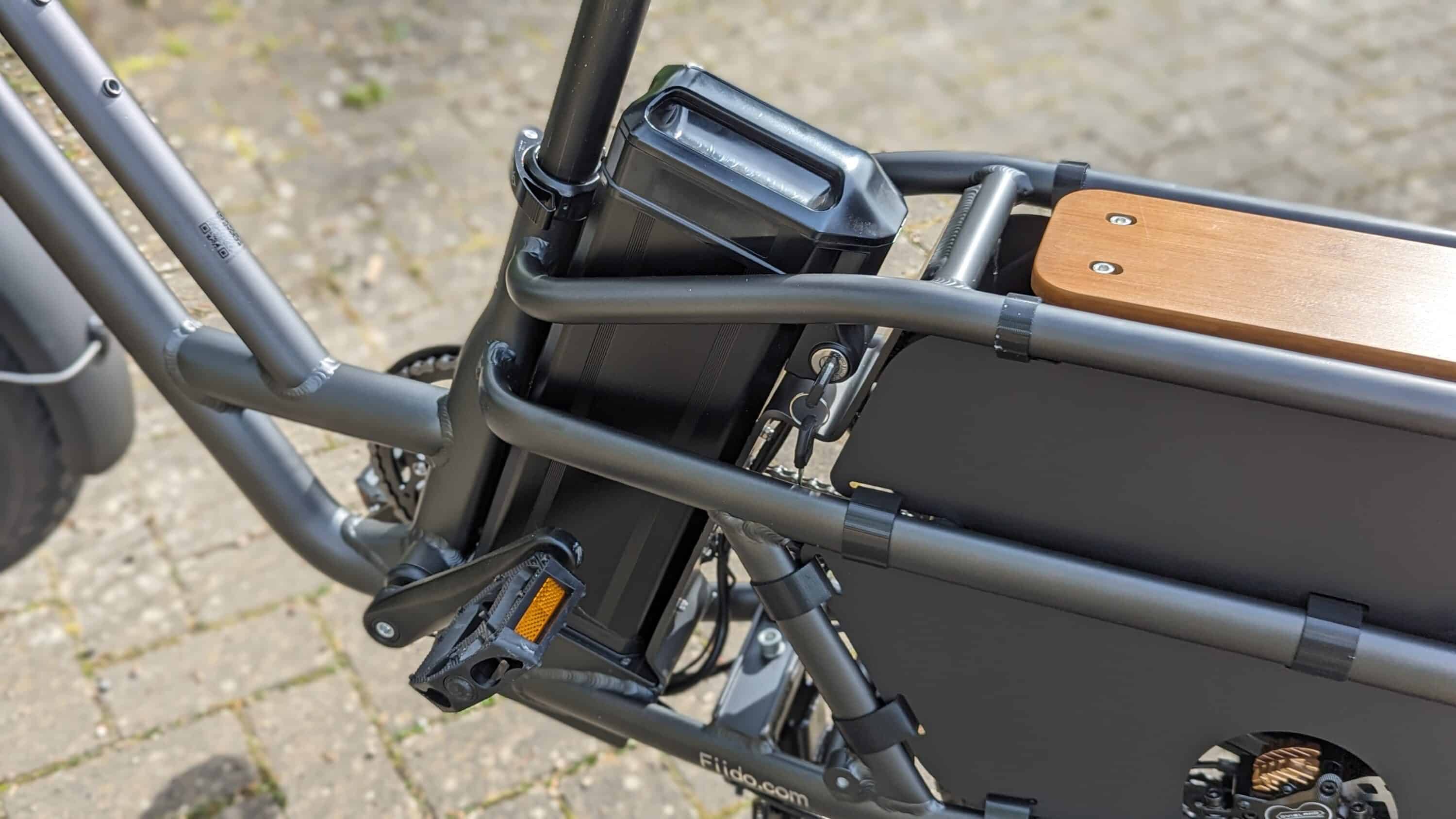 Der riesige Akku nimmt unterhalb des Sattels Platz und ist durch ein Schloss gegen Diebstahl geschützt. Er kommt auf eine Kapazität von 998 Wattstunden und verfügt über einen praktischen Griff, um ihm zum Laden entnehmen zu können.