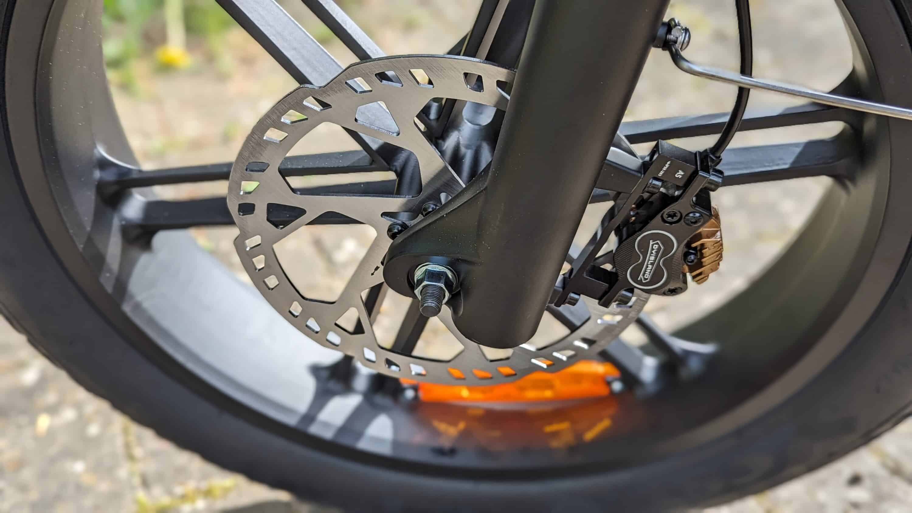 Entsprechend nimmt Fiido das Thema Sicherheit sehr ernst. Das beginnt beispielsweise bei den Bremsen. Zum Einsatz kommen wuchtige 4-Kolben-Hydraulik-Bremsen, die mit Bremsscheiben mit satten 230 mm Durchmesser ausgestattet sind. Damit verzögert das T2 auch voll beladen innerhalb kurzerster Zeit und kommt zum Stehen.