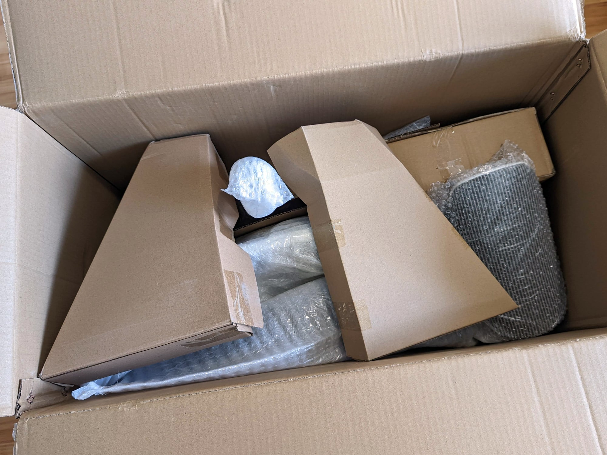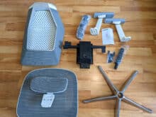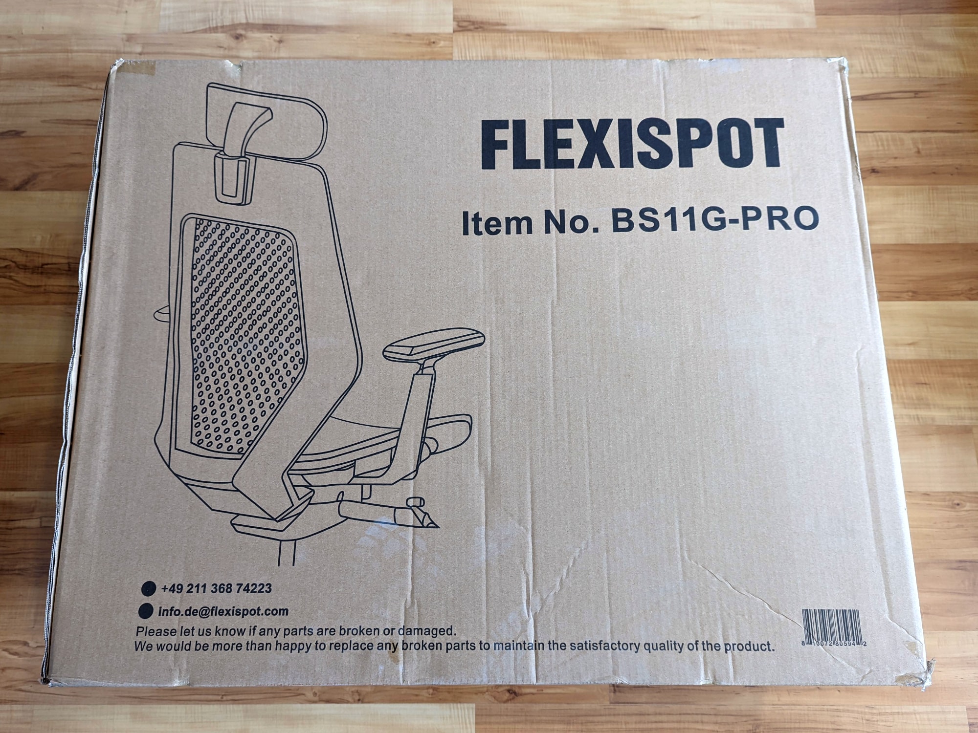Der Flexispot Backsupport BS11 Pro kommt in einem großen braunen Karton. Neben der Modellbezeichnung ist auf diesem auch eine Zeichnung des Bürostuhls abgebildet. Im Inneren befinden sich, teils in kleineren Kartons oder nochmals mit Luftpolsterfolie verpackt und gut geschützt, die Einzelteile des BS11 Pro, Schrauben, Inbusschlüssel und eine kurze Montageanleitung. Der Bürostuhl setzt sich aus den üblichen Einzelteilen zusammen, die Montage erfolgt in insgesamt sechs Schritten.