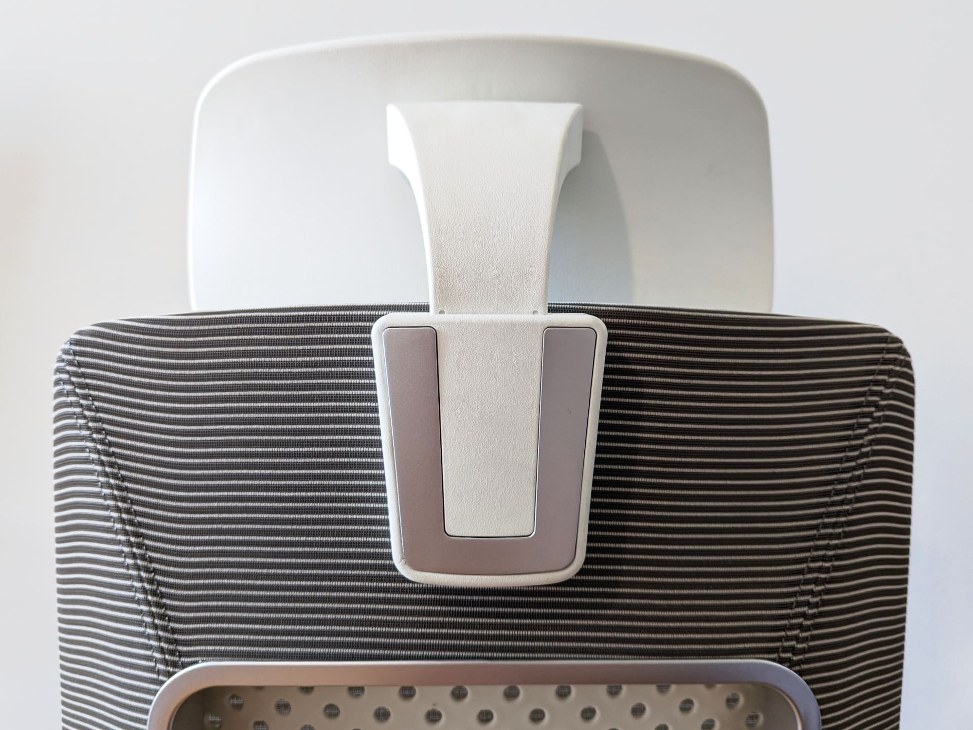 - Die Kopfstütze wird an der Rückseite des Stuhls befestigt und anschließend die Abdeckung draufgesteckt.