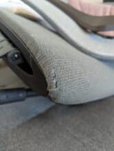 Damit man die Kopfstütze in der Höhe verstellen und auch wieder arretieren kann, gibt es eine kleine Schraube am Gestell der Kopfstütze, die gelockert oder festgezogen werden kann. Ist sie gelockert, dann soll die Kopfstütze in der Höhe verstellbar sein. Ist sie hingegen festgezogen, dann sollte sie eigentlich in der Höhe arretiert sein. Sie wirklich zu arretieren war jedoch ein Ding der Unmöglichkeit. Egal wie fest ich die Schraube angezogen habe, die Kopfstütze ist immer wieder nach unten gerutscht, sobald ich meinen Kopf angelehnt habe. Die wahrscheinliche Ursache des Problems habe ich in der Mechanik der Kopfstütze ausfindig machen können.