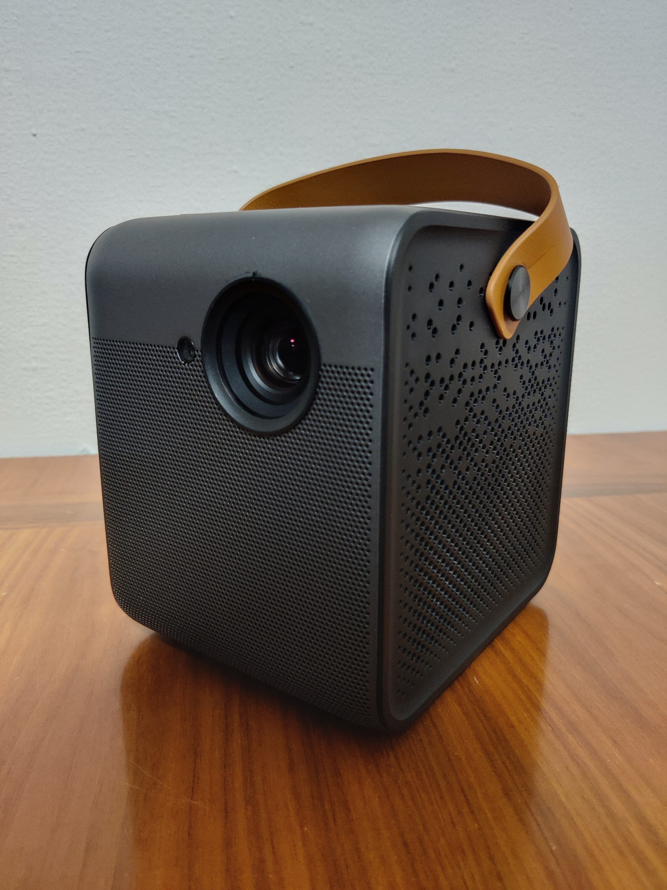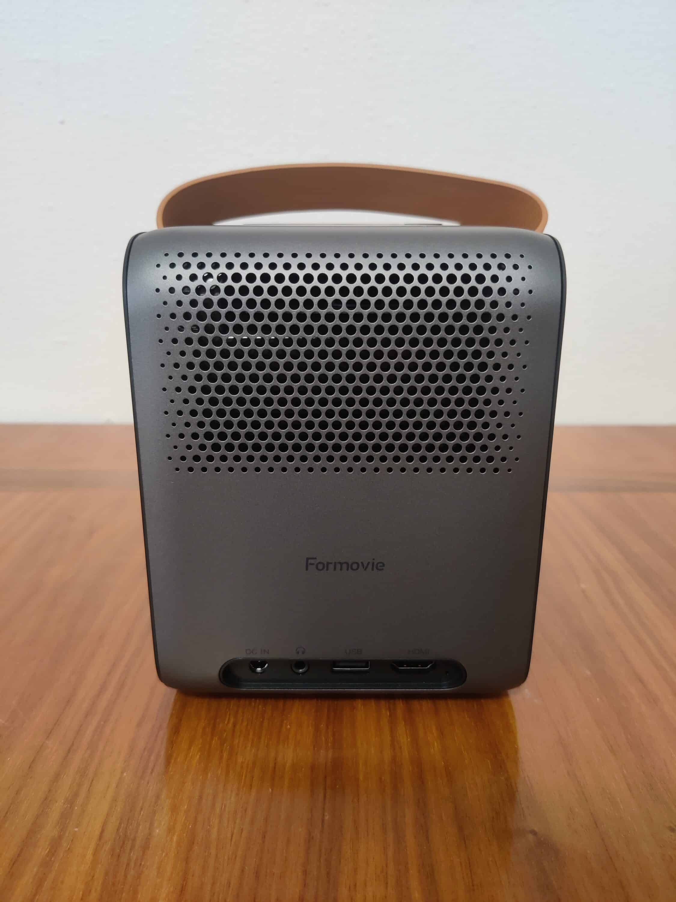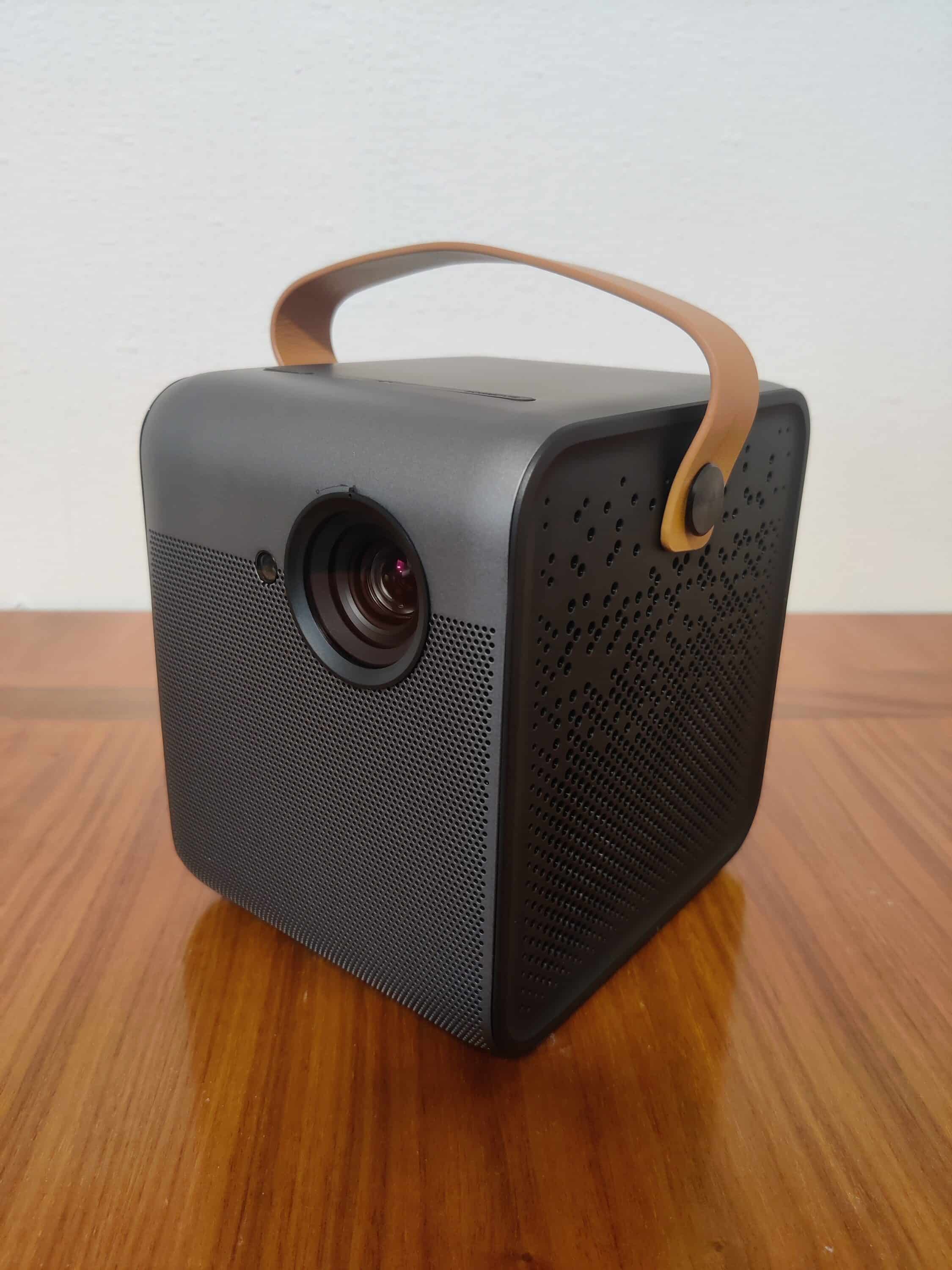 Positiv ins Gewicht fällt dabei die Verarbeitung des Mini-Beamers aus. Formovie setzt für das Gehäuse auf ein modernes und zeitloses Design in dezentem Grau. Die Oberfläche selbst ist dabei matt gehalten, wohingegen der Dice buchstäblich einem Würfel ähnelt. Dies sieht nicht nur hochwertig aus, sondern fühlt sich obendrein durchweg solide an. Ein Eyecatcher ist der orange-beigefarbene Leder-Henkel auf der Oberseite des Beamers, welcher zugleich als Tragehalterung zum Transport dient.