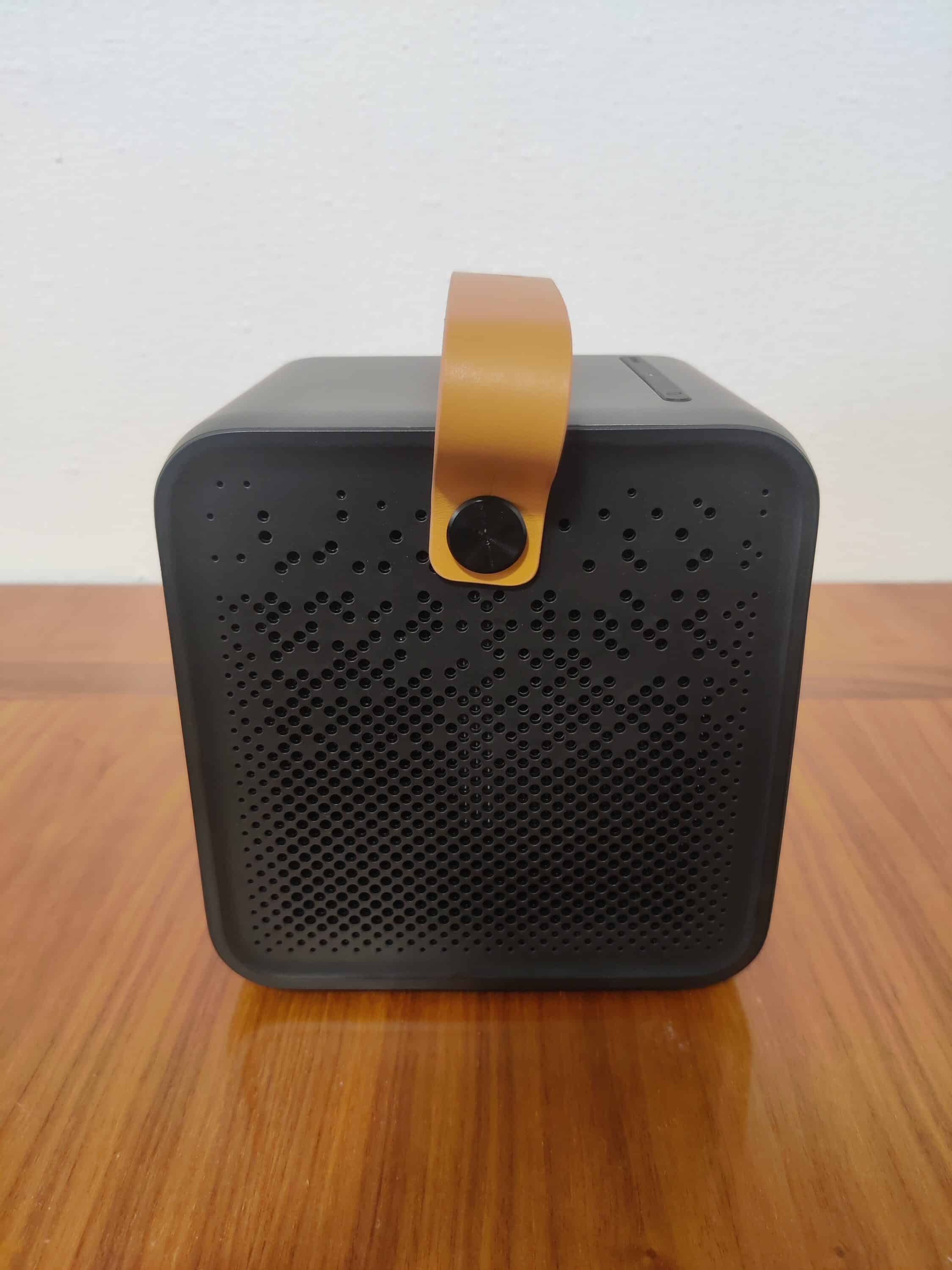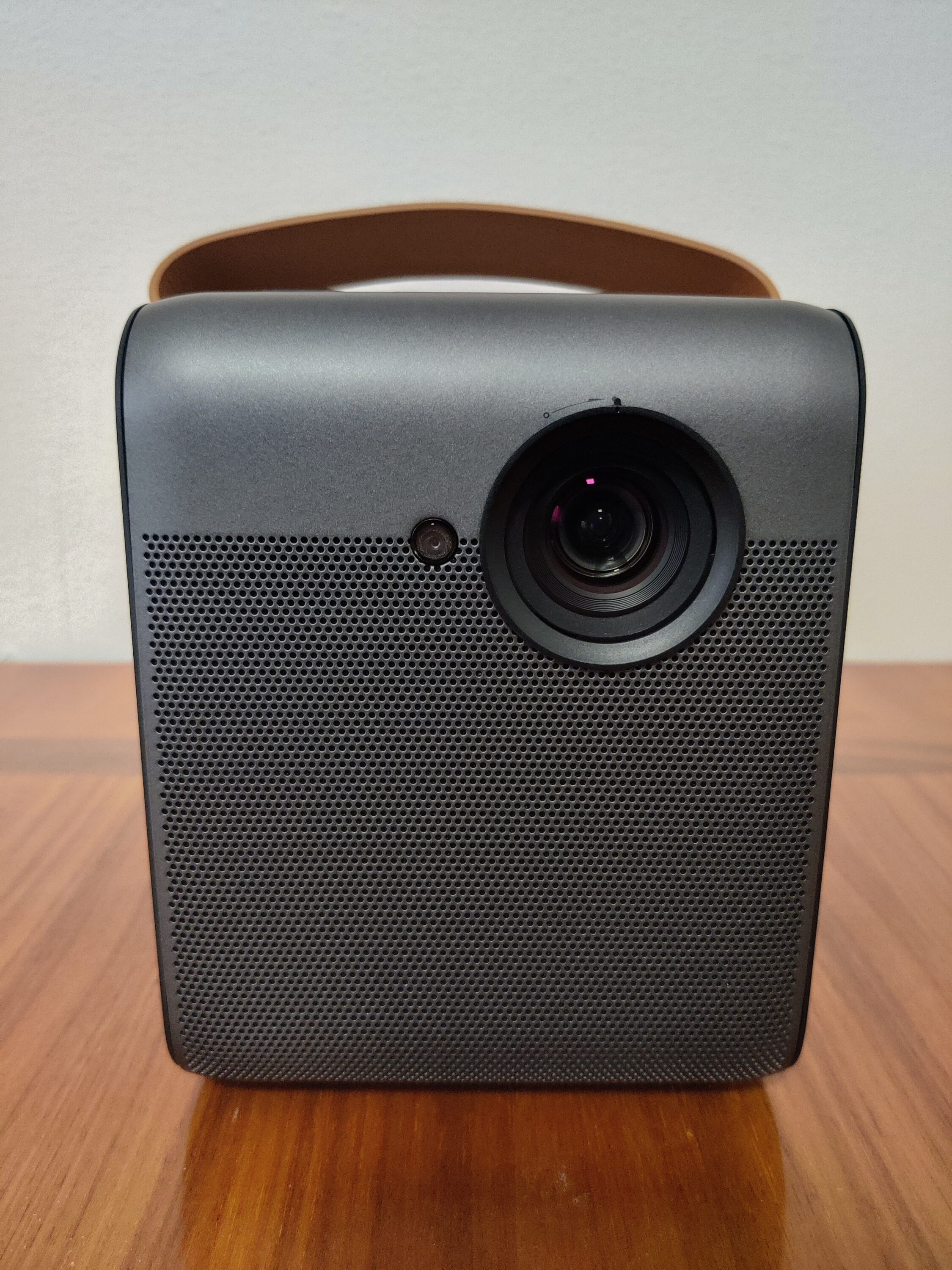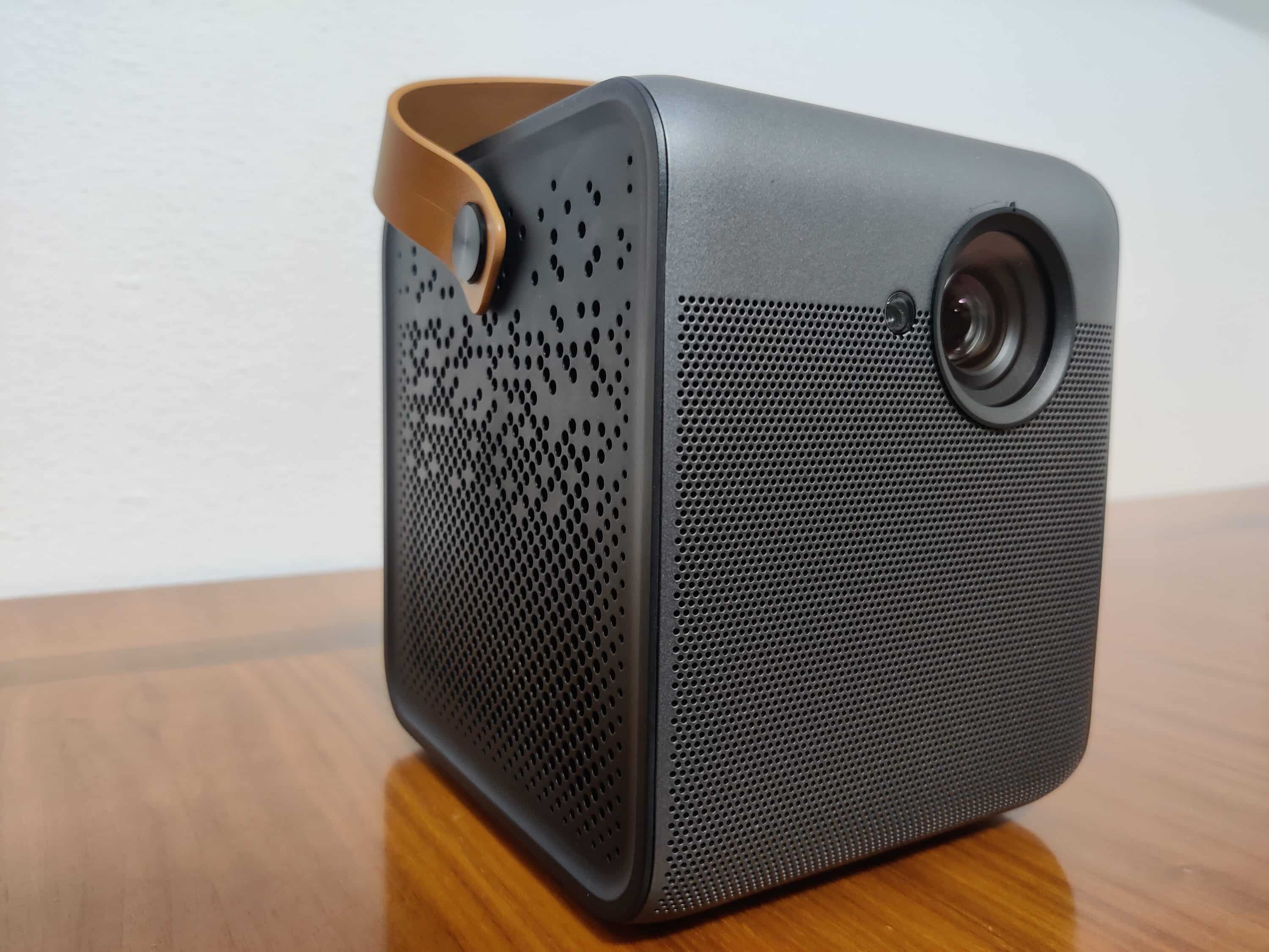 Positiv ins Gewicht fällt dabei die Verarbeitung des Mini-Beamers aus. Formovie setzt für das Gehäuse auf ein modernes und zeitloses Design in dezentem Grau. Die Oberfläche selbst ist dabei matt gehalten, wohingegen der Dice buchstäblich einem Würfel ähnelt. Dies sieht nicht nur hochwertig aus, sondern fühlt sich obendrein durchweg solide an. Ein Eyecatcher ist der orange-beigefarbene Leder-Henkel auf der Oberseite des Beamers, welcher zugleich als Tragehalterung zum Transport dient.
