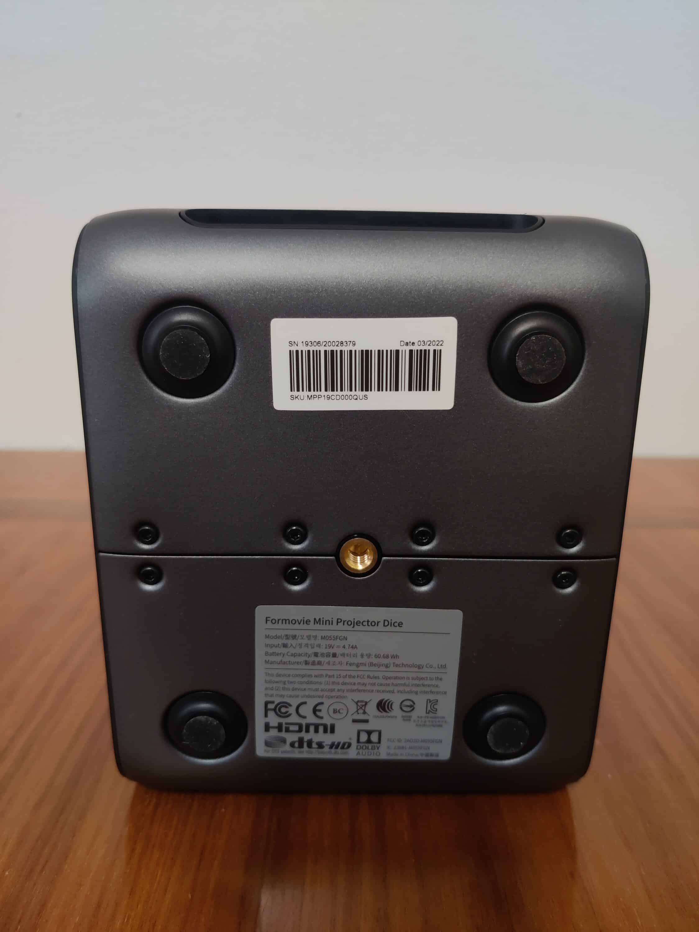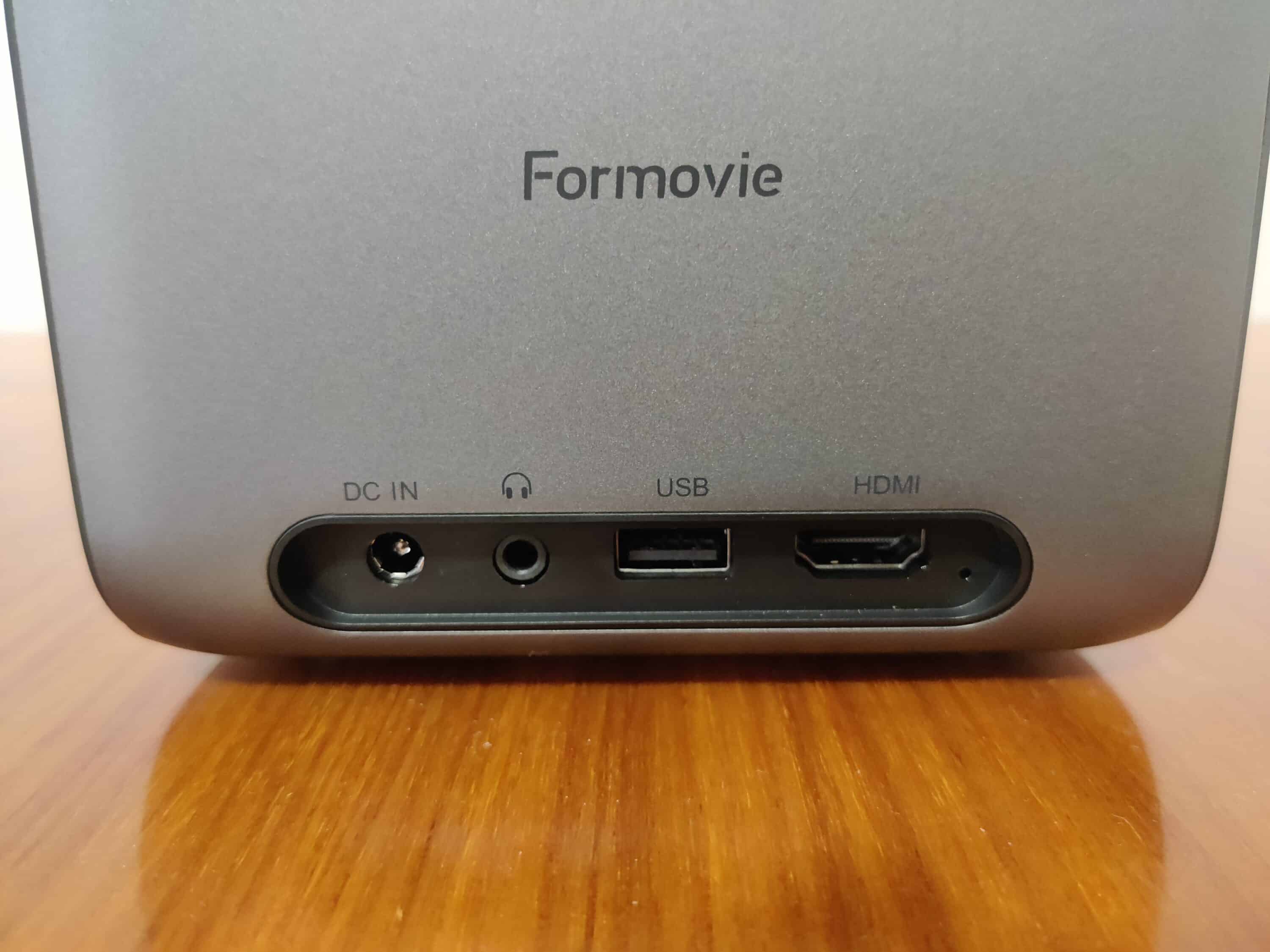 Sämtliche Anschlussmöglichkeiten befinden sich auf der Rückseite des Formovie Dice. Dazu gehören von links kommend der Strom- und Kopfhöreranschluss, ein USB 2.0-Eingang mit Support für USB-To-Ethernet und zusätzlich ein HDMI-Port für das Verbinden mit einem weiteren Ausgabegerät. Zur weiteren Ausstattung sind ebenso WIFI und Bluetooth 4.0 integriert.