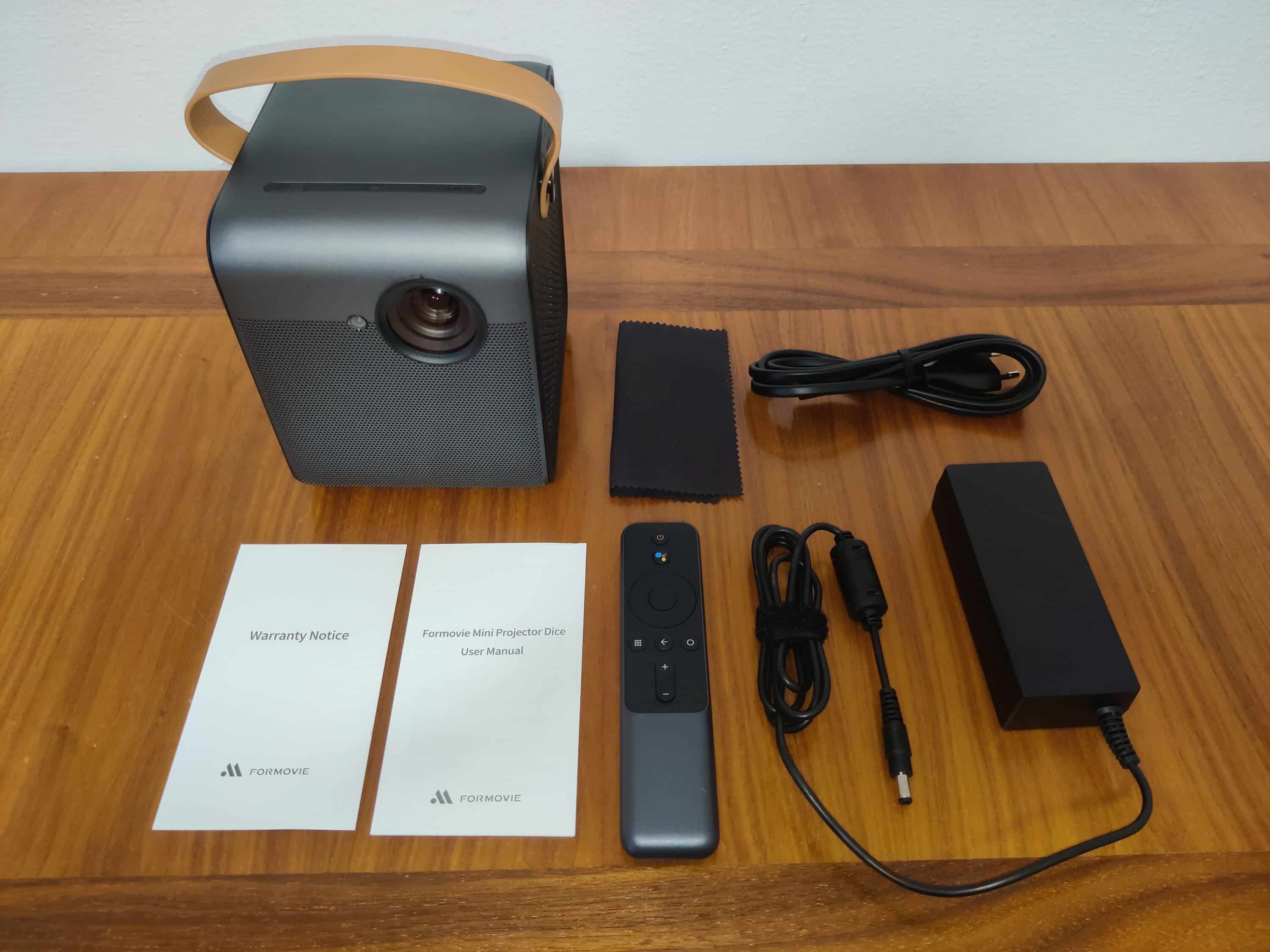 Neben dem Formovie Dice und der zugehörigen Fernbedienung liegen ebenso ein Netzteil und ein Reinigungstuch für die Linse des Projektors im Lieferumfang bei. Obendrein befinden sich die Bedienungsanleitung und ein Garantiehinweis im eher unauffällig weißen Karton.