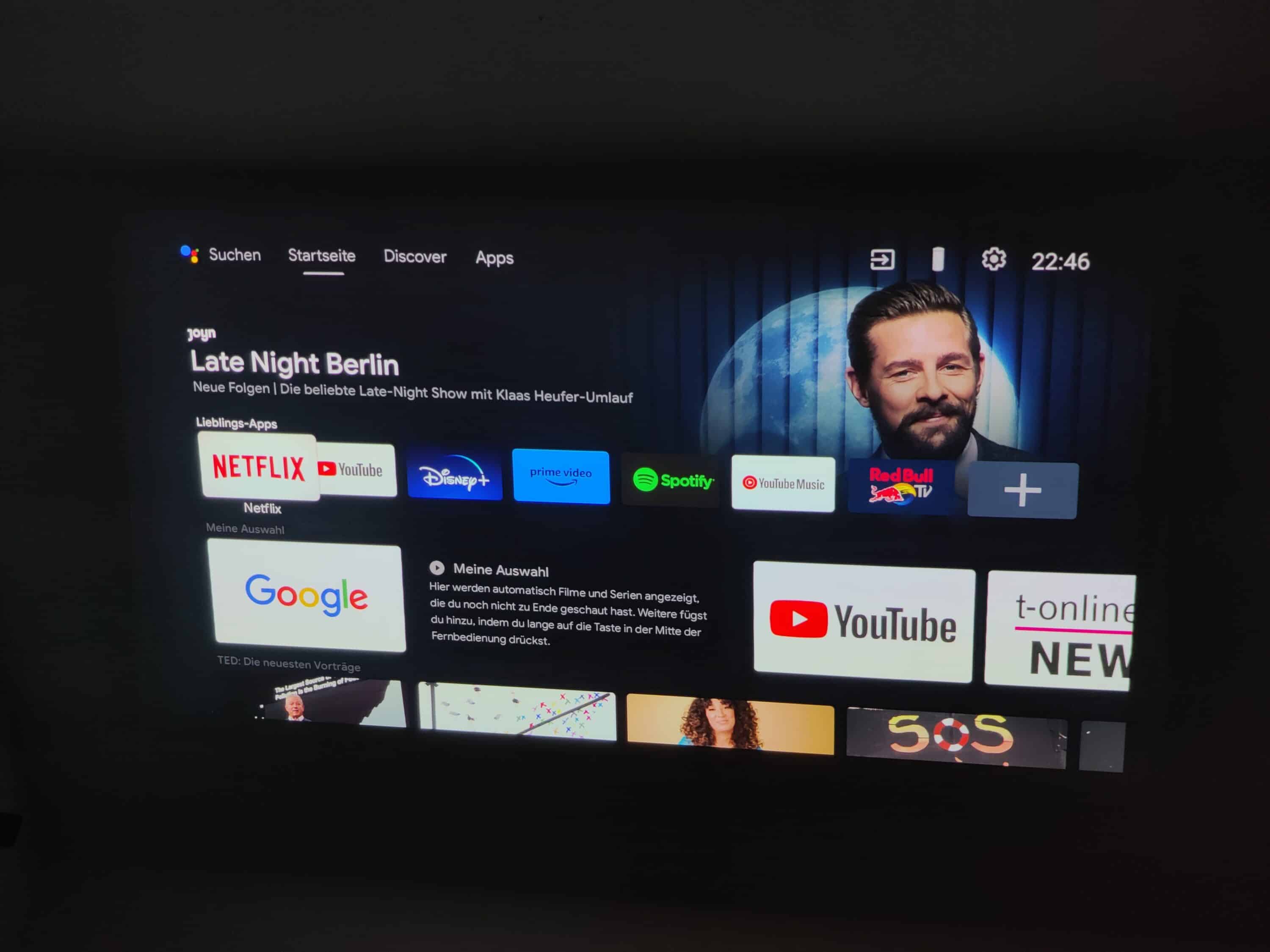 Als Betriebssystem setzt der Mini-Projektor auf Android TV in der Version 9.0, welche eine recht einfache Bedienung ermöglicht. Dadurch ist es möglich, dass sich zahlreiche Apps aus dem Play Store komfortabel hinzufügen lassen. Netflix ist in unserer EU-Version ab Werk nicht verfügbar und selbst über eine Suche im Play Store nicht auffindbar– eine Installation der App ist lediglich über das Sideloading der APK per USB-Stick möglich. Dabei konnten wir keine Einschränkungen feststellen und auch das Streaming in Full HD-Auflösung funktionierte ohne Ruckler.