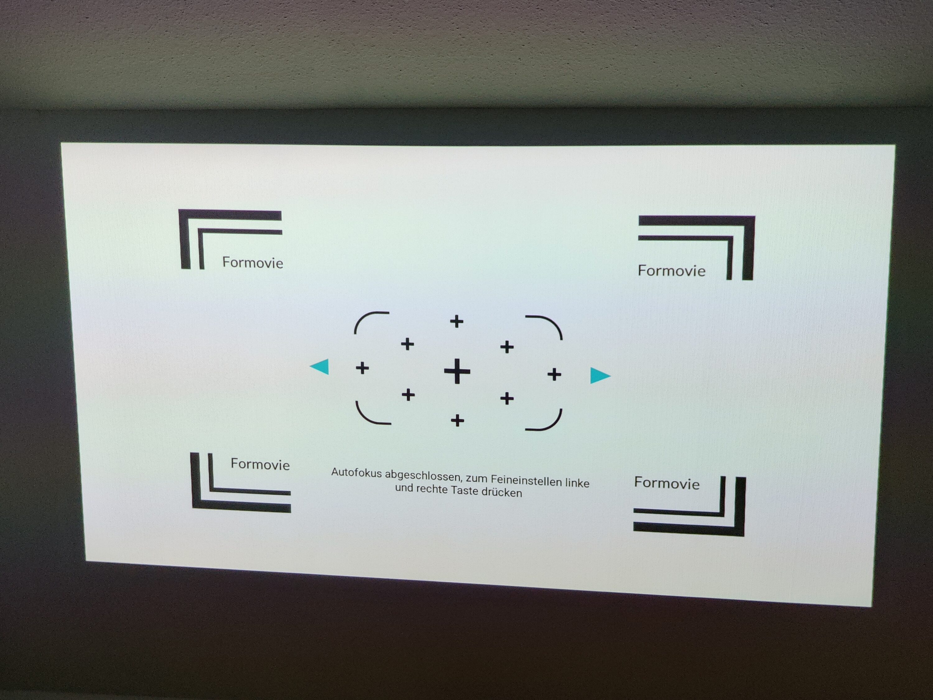 Der Autofokus wird beim Starten des Mini-Projektors automatisch ausgeführt, um im Anschluss das optimale Bild auf die zu projizierende Oberfläche zu zaubern. Dieser Vorgang dauert knapp 10 Sekunden und funktioniert in unseren Tests allesamt sehr gut. Alternativ lässt sich über die Einstellungen auch das Bild feinjustieren, was wir bislang nur einmal in Anspruch nehmen mussten.