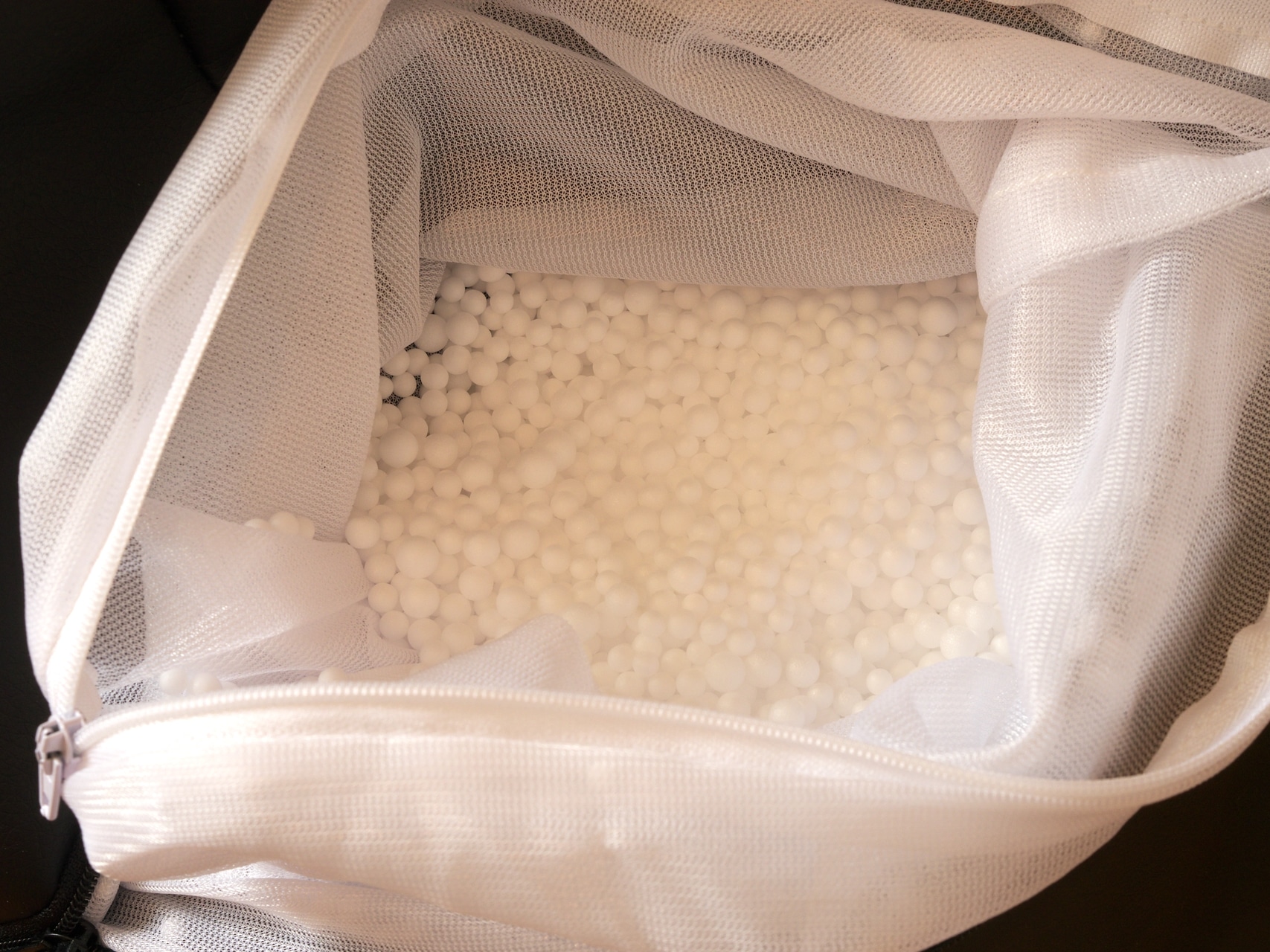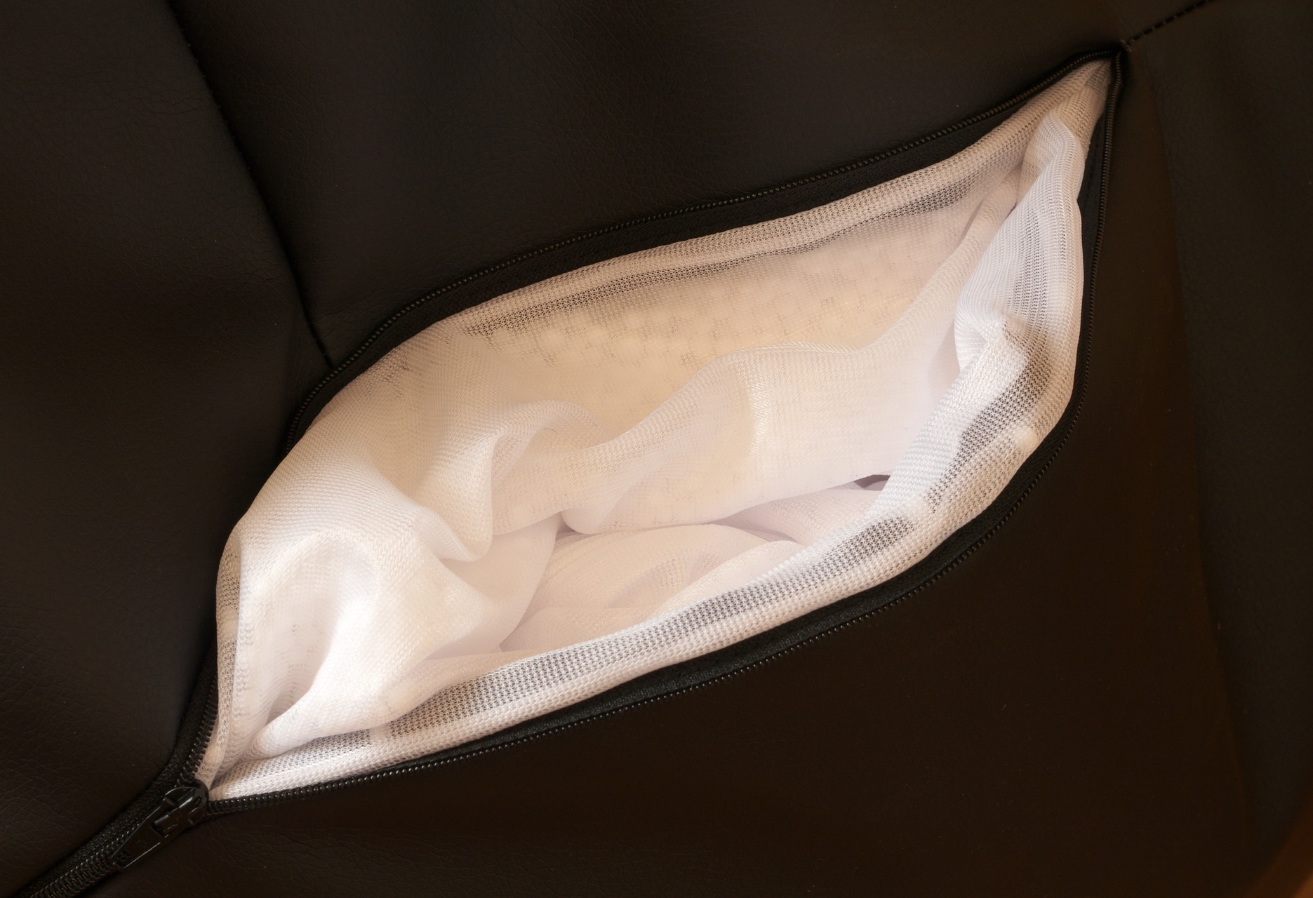 Zuletzt befinden sich am Gamewarez Morph noch ein Herstellerlabel am Reißverschluss und eines der üblichen Textilien-Label mit Material- und Waschhinweisen sowie ein Reißverschluss zur Befüllung an der Unterseite. Öffnet man letzteren, so gelangt man an ein weißes Netz mit einem weiteren Reißverschluss, hinter dem sich die eigentliche Füllung des Sitzsacks befindet. Diese besteht dabei aus kleinen, weißen Polystyrol-Kügelchen, die von Gamewarez auch als Nachfüllmaterial angeboten werden.