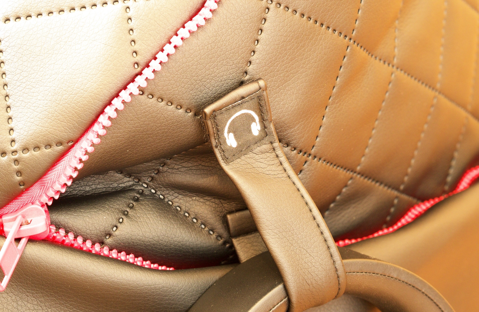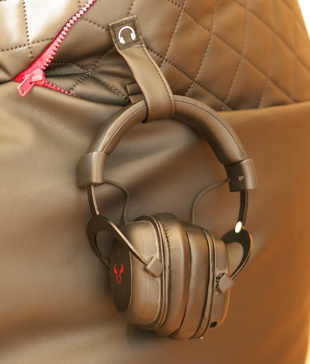 Eine Seite der Halteschlaufe sowie die Ränder der Tragetasche sind dabei fest mit der Kunstlederoberfläche vernäht. Das zweite Ende der Halteschlaufe und der Mitteltrenner der Tasche werden hingegen durch einen Klettverschluss am Morph gehalten, sodass man das Headset leicht befestigen und die Tragetasche wahlweise als Ganzes oder in zwei Einzelsegmenten verwenden kann.