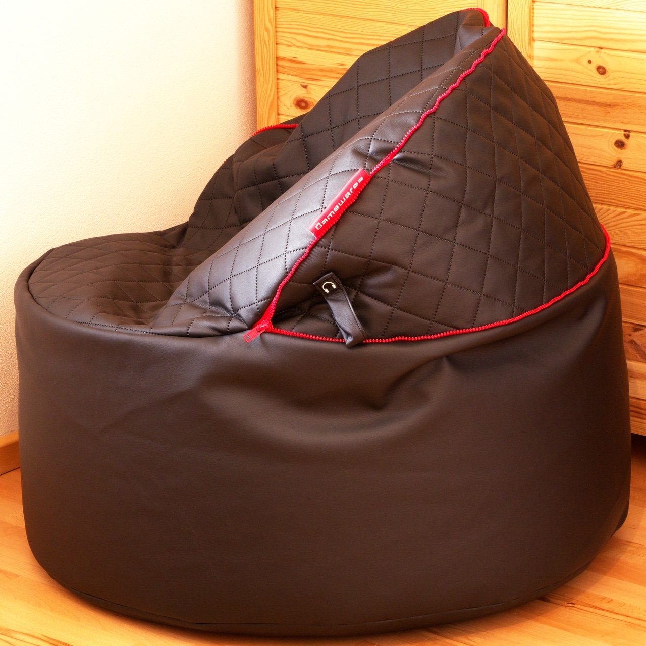 Gamewarez bietet den Sitzsack wahlweise mit Kunstleder- oder mit Samtbezug an. In ersterem Fall kann man zwischen schwarzen, blauen und roten Nähten wählen, wohingegen die Nähte beim Samtbezug immer schwarz sind und man sich dafür zwischen schwarzem und grauem Samt entscheiden kann. Bei uns im Test befindet sich dabei heute die Variante mit Kunstleder und roten Nähten, die als „Crimson Morph“ vermarktet wird.