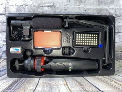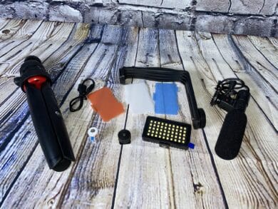 Den gesamten Lieferumfang haben wir in der Einleitung schon mal angeschnitten – nun geht es aber nochmal ins Detail. Gelid liefert abgesehen von dem Tripod mit universeller Handy- und Kamerahalterung, ein Bluetooth-Remote-Shutter, das Shotgun-Mikrofon mit Windschutz, eine einfache portable LED-Beleuchtung mit Halterung und drei Dimmern in verschiedenen Farben, welche wir durch das zusätzlich gelieferte Micro-USB-Kabel laden können. Damit hat man im Grunde genommen alles, was man zum Starten benötigt.