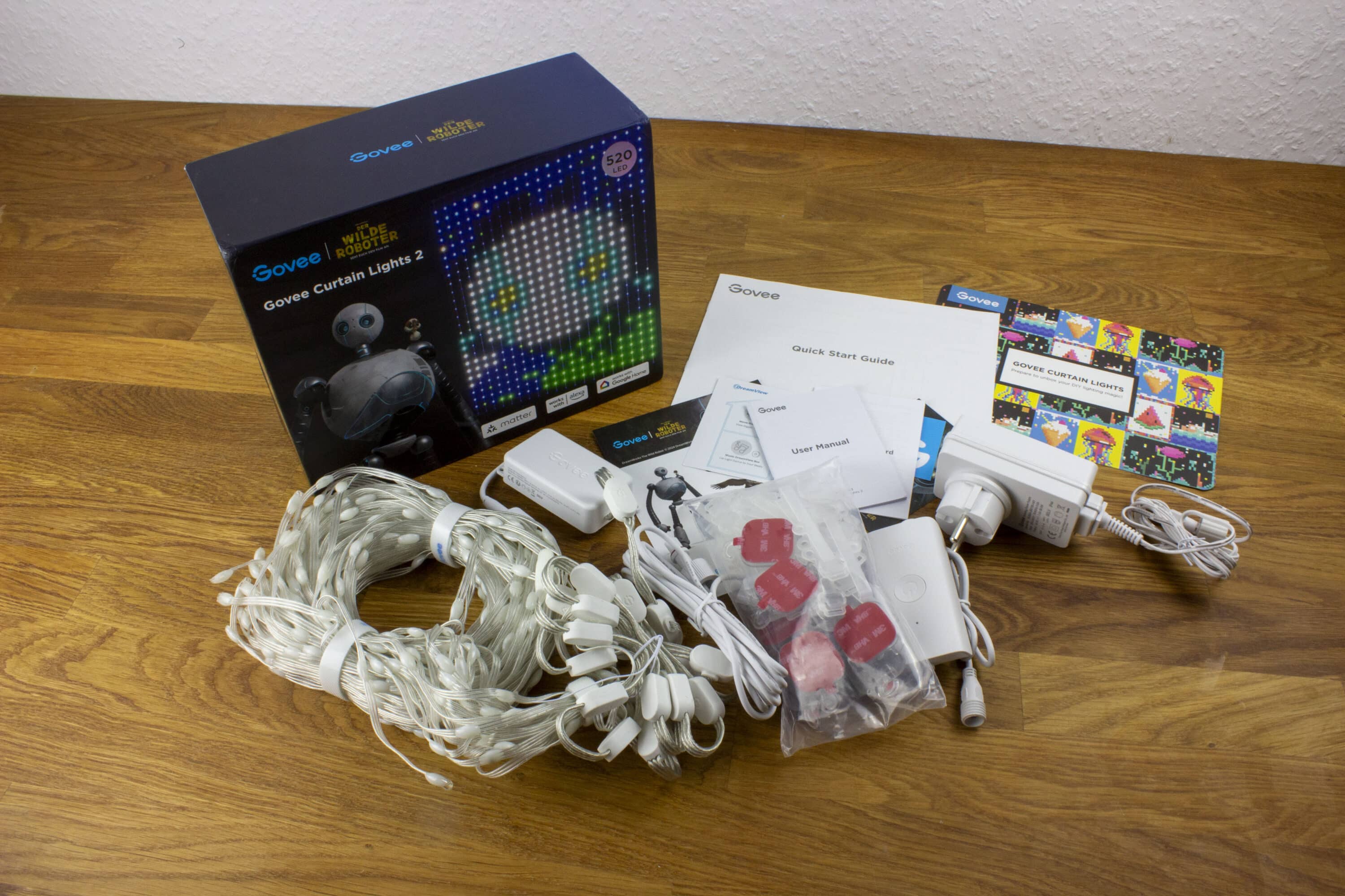 Das normale Paket enthält einmal die Govee Curtain Lights 2. Diese haben eine Abmessung von 1,5 Meter * 2 Meter. Auf der Breite sind insgesamt 20 Stränge vorhanden, auf welchen die 520 LEDs aufgeteilt sind. Die Konstruktion ist stabil und die Stränge halten gut die Position ohne viel zu wackeln. Ein gewisse Steifheit ist also gegeben.