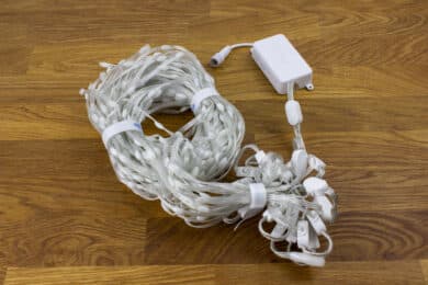 Neben der Beleuchtung ist im Lieferumfang noch ein Netzteil (36W) sowie das Steuergerät bei. Zur Befestigung haben wir noch 12 Haken und 22 Bändern mit dabei. Letzteres hilft dann um die einzelnen Elemente im selben Abstand zu halten.