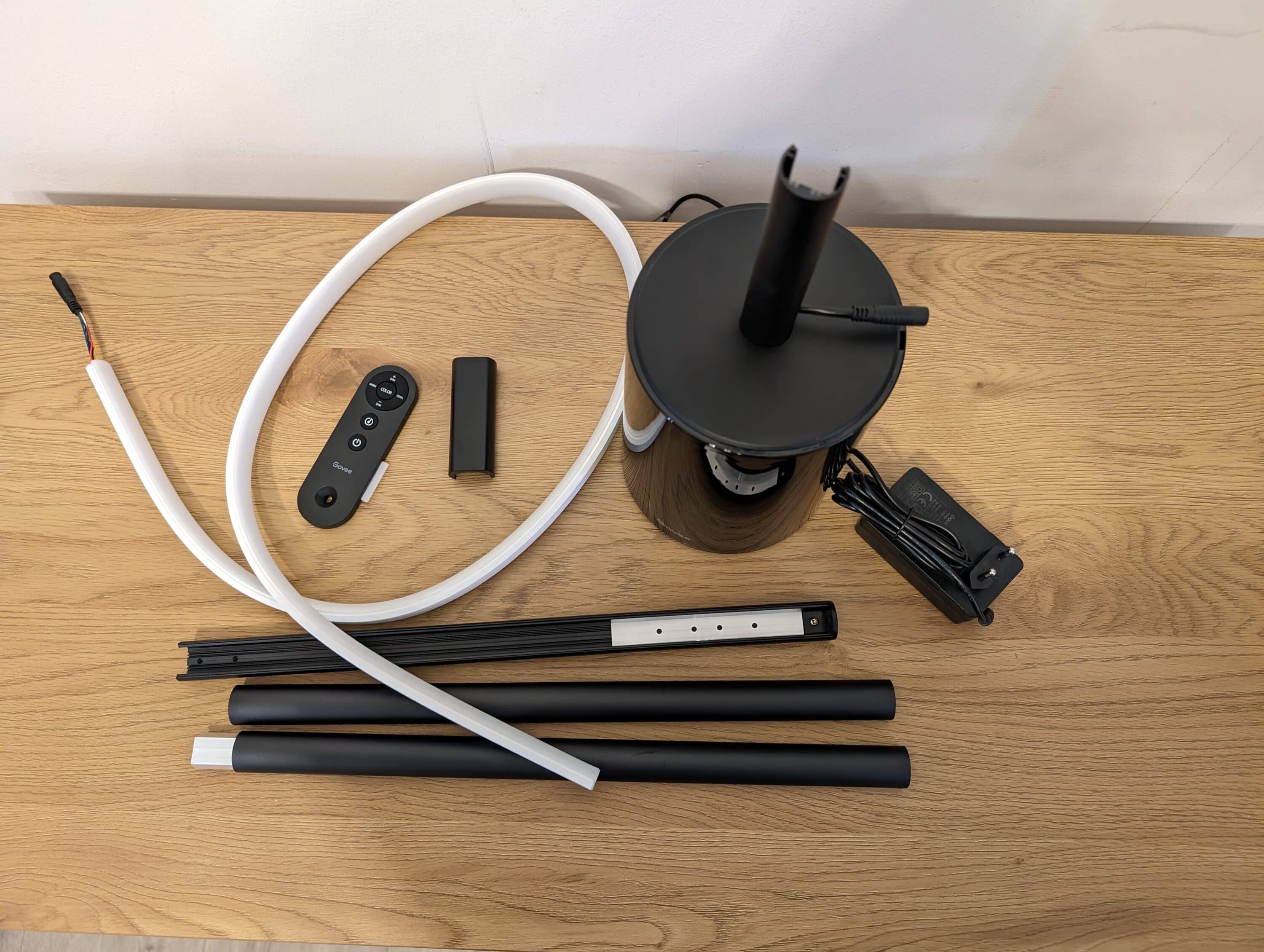 Da der Karton aber nur 43 cm hoch ist wird schnell klar: Hier müssen wir noch selbst Hand anlegen und die Leuchte erst einmal zusammenbauen. Dabei setzt sich der Lieferumfang aus verschiedenen Bauteilen zusammen. Fertig montiert ist die rund 20 cm hohe Basis der Leuchte, die an der Oberseite über einen Stromanschluss für den Lichtschlauch, sowie den Anfang der Halterung verfügt und unten ans Stromnetz angeschlossen wird.