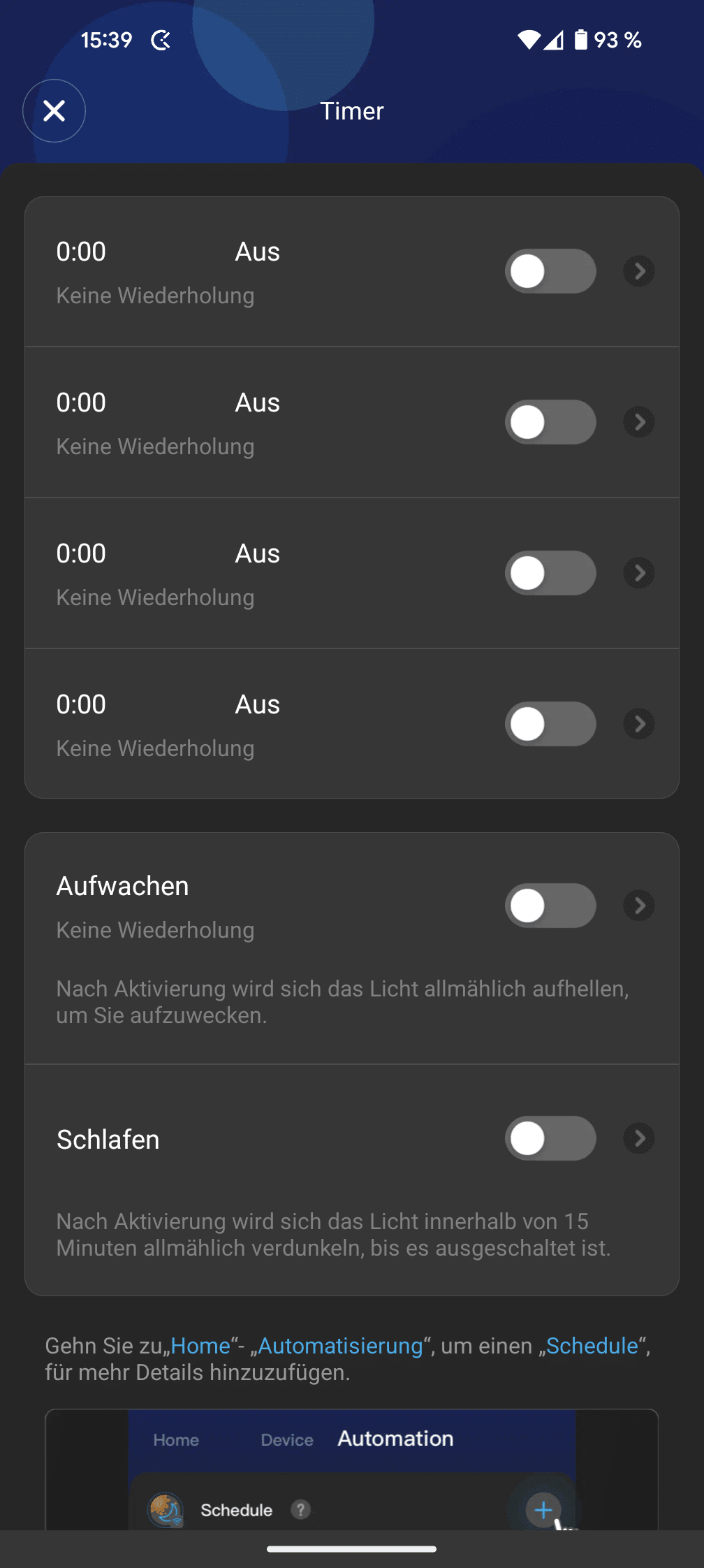 Dann finden wir uns im aufgeräumten Haupt-Bildschirm wieder, in dem sich sogar der Leuchtschlauch und die Basis getrennt voneinander ein- und ausschalten lassen. Darunter finden wir verschiedene Möglichkeiten wie die Möglichkeit, die Leuchte per Timer zu steuern oder eigene Effekte und Farben zu erstellen und abzuspeichern.