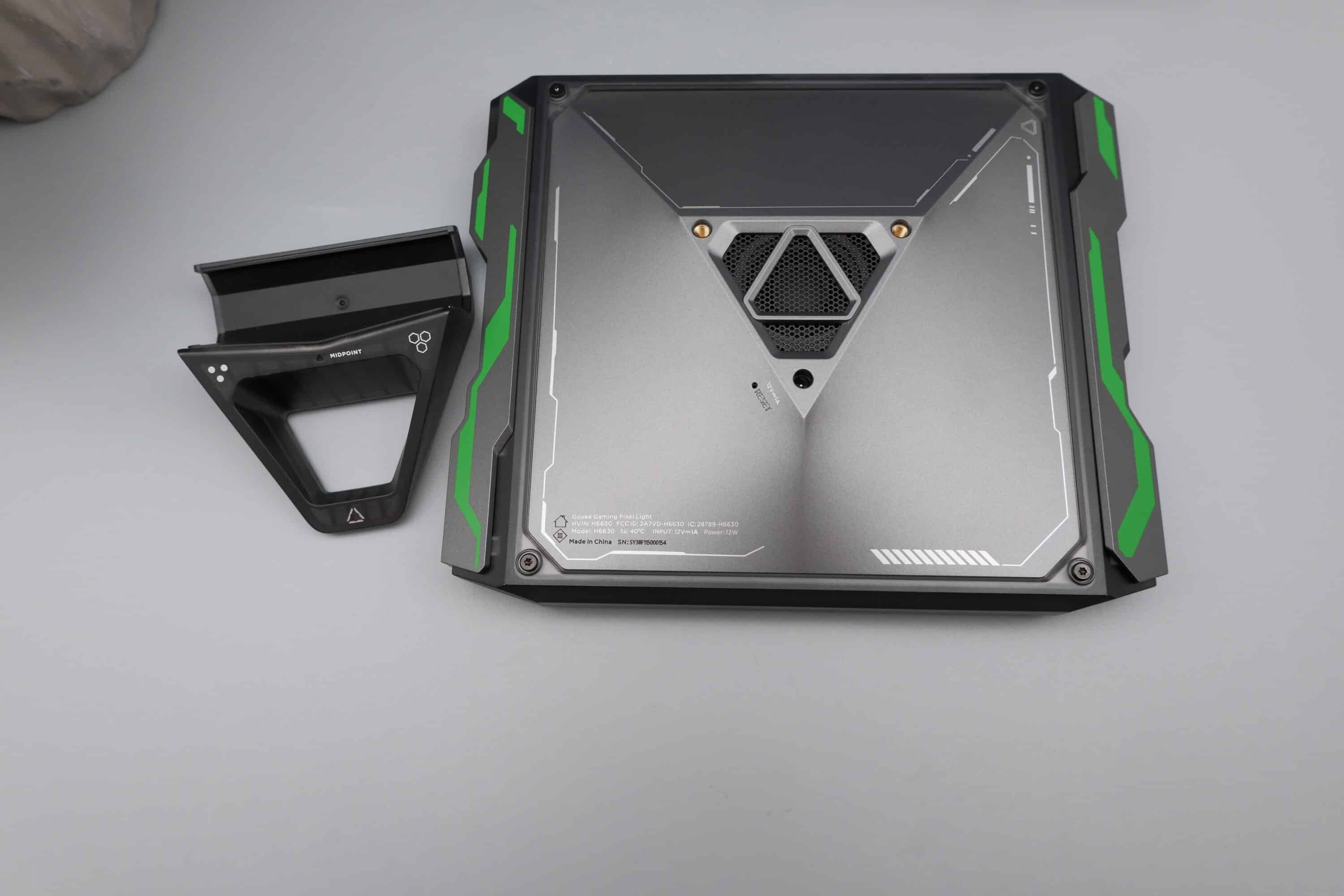 Die Rückseite läuft dabei mittig in einem Dreieck spitz zu. In der Mitte findet sich ein Lüfter der im eingeschalteten Zustand durchaus zu hören ist – wenn auch nicht zu laut. Zudem will das Govee Gaming Pixel Light mit einem Stromkabel ebenfalls an der Rückseite versehen werden, damit es funktioniert.
