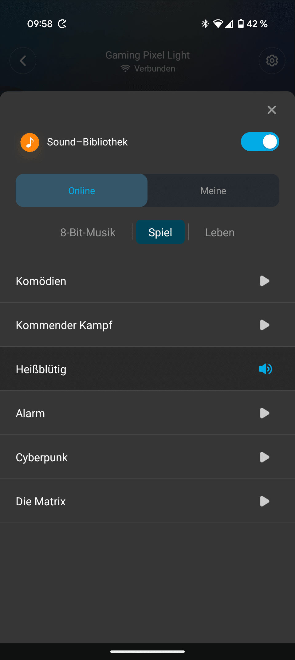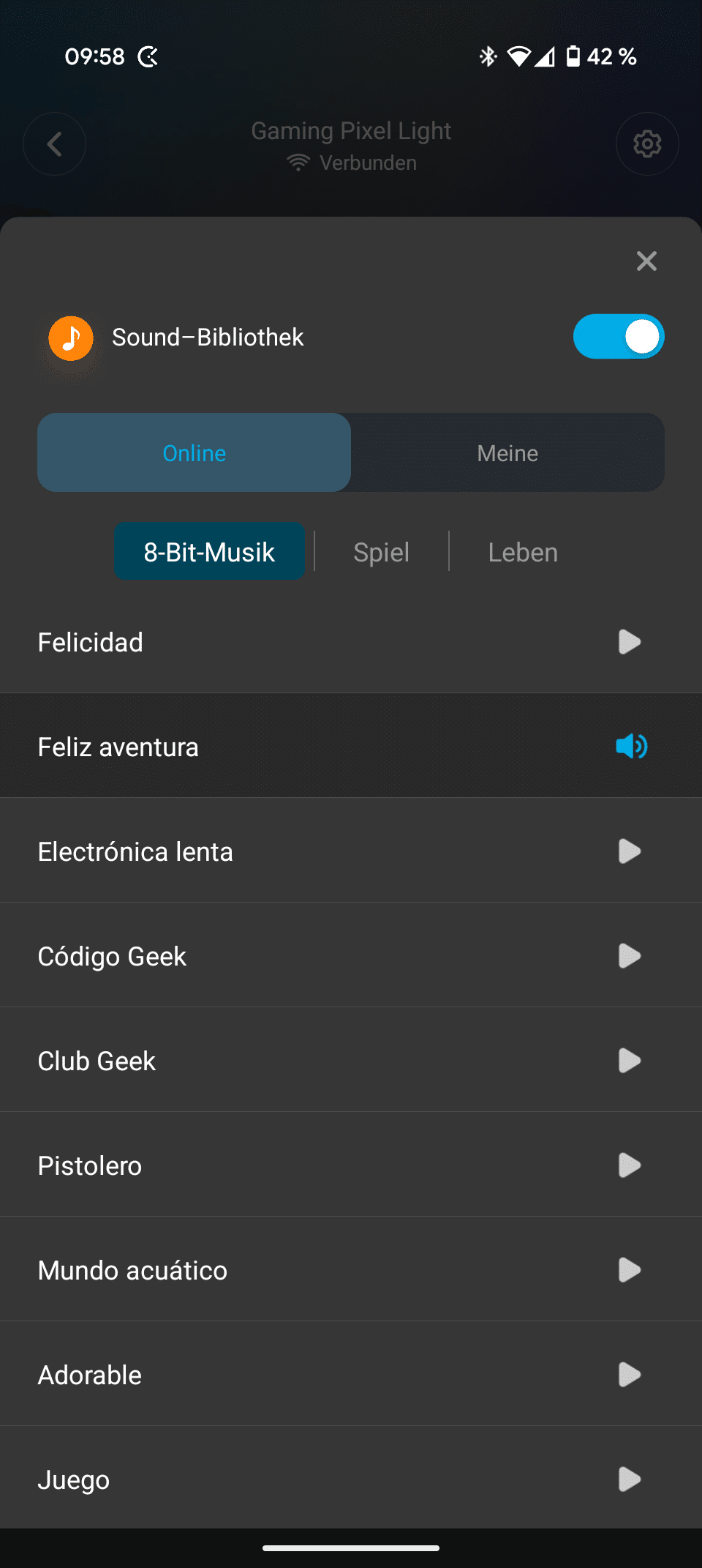 Außerdem legt ihr auf Wunsch Wiedergabelisten an, bei denen sich bis zu 20 Effekte mit Musik kombinieren lassen. Das Der Govee Gaming Pixel Light kann auch Musik wiedergeben. Dafür stehen euch eine überschaubare Anzahl an 8-Bit- und Gaming-Sounds, sowie fünf weitere Soundeffekte zur Wahl. Eigene Sounds lassen sich als .wav, .mp3 oder .ogg hochladen.