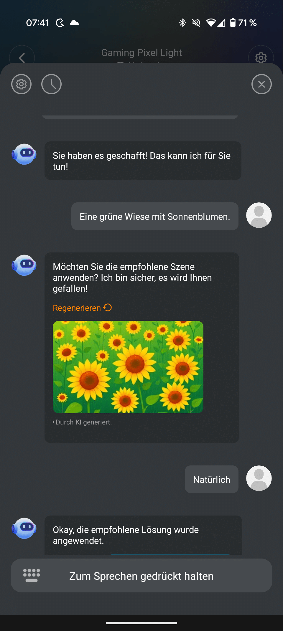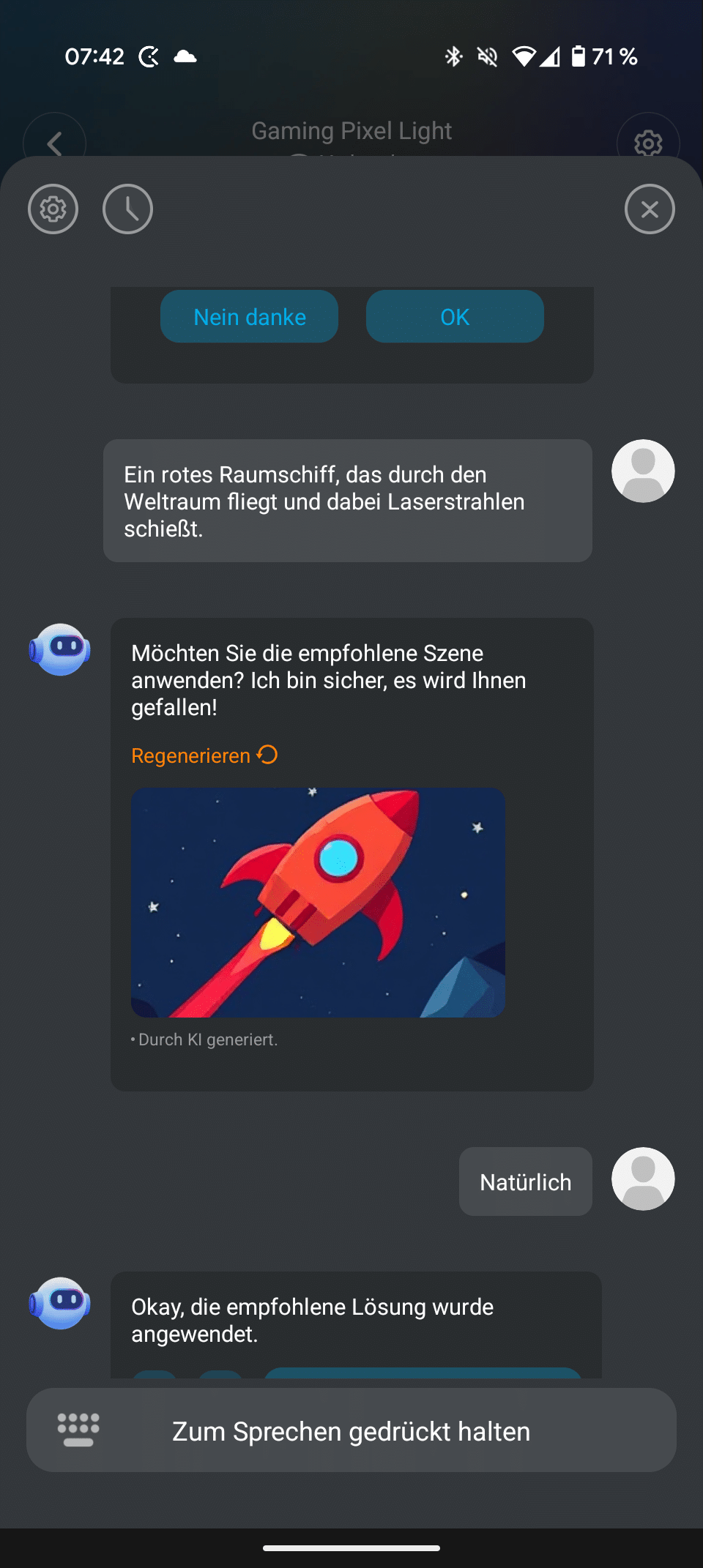 Es gibt auch ein AI-Feature, bei dem ihr dem Chatbot Prompts für eigene Ideen liefern könnt. Nett, die Ergebnisse sind aber leider eher bedingt passend. Zumal der Bot nicht in der Lage war, animierte Bilder zu erstellen – und genau die zeichnen das Govee Gaming Pixel Light eigentlich aus.