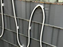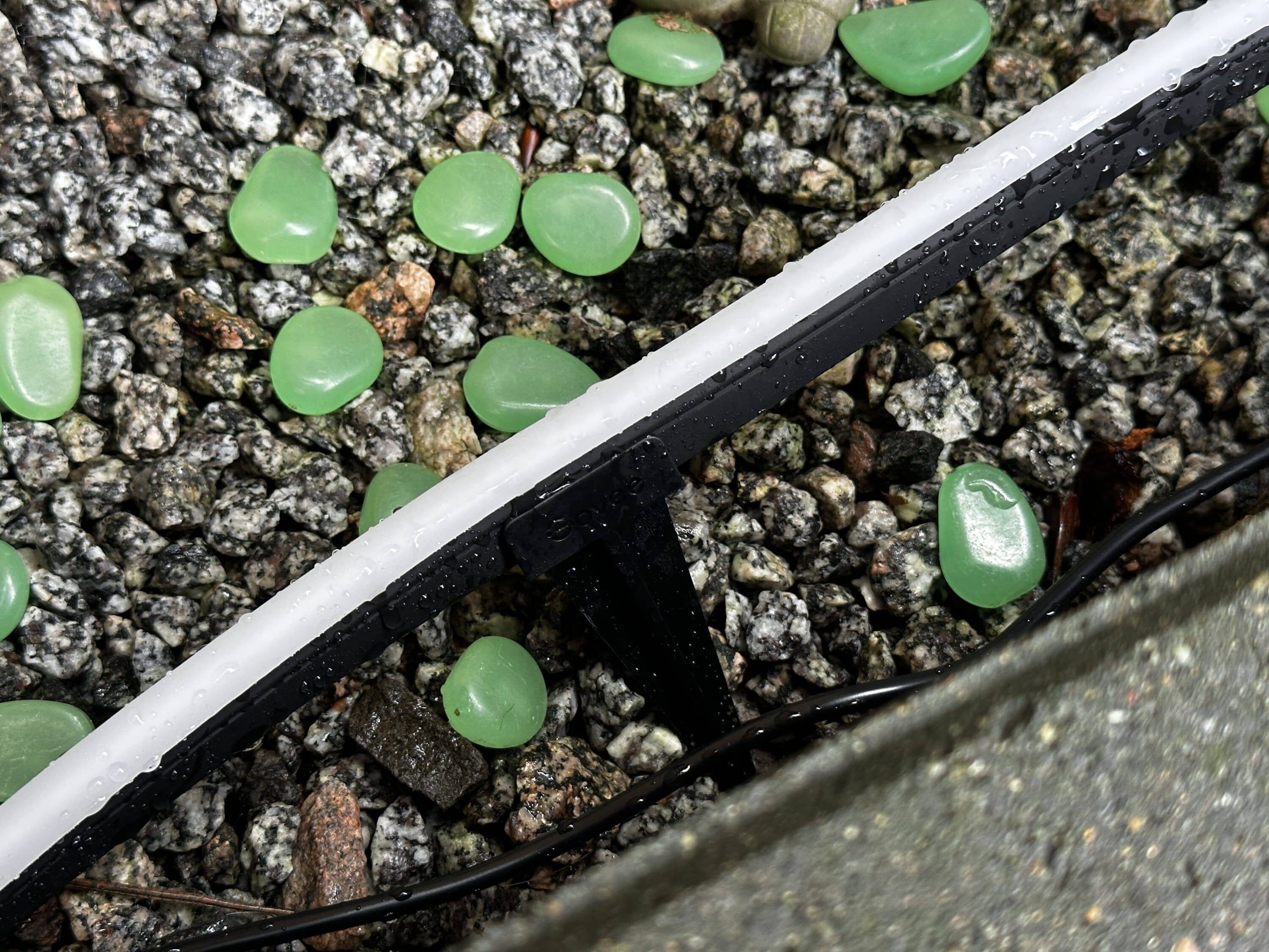 Für die Montage stehen zahlreiche Kunststoffclips mit 3M-Kleber sowie Kunststoffclips mit Spieß zur Verfügung, die sich in beiden Fällen bestens bewährt haben. LED-Strip in den Clip drücken und nur noch den Kleber vom Kunststoff lösen – fertig! Die selbstklebenden Clips halten mit Bravour an der Steinunterseite und am Zaun, die Spieße sitzen auch im Kies fest im Boden und machen keine Probleme. Die Montage ist also einfach und in wenigen Minuten erledigt, wenn man sich nicht für ein kompliziertes Muster entschieden hat. Bei etwas komplizierteren Formen mit scharfen Ecken muss man bei der Befestigung besonders aufpassen, da es wie bei mir passieren kann, dass die Spannung zu hoch ist und sich der LED-Streifen löst. In meinem Fall kann das aber auch an den Plastiklamellen des Zauns liegen, da diese nicht besonders straff sitzen.