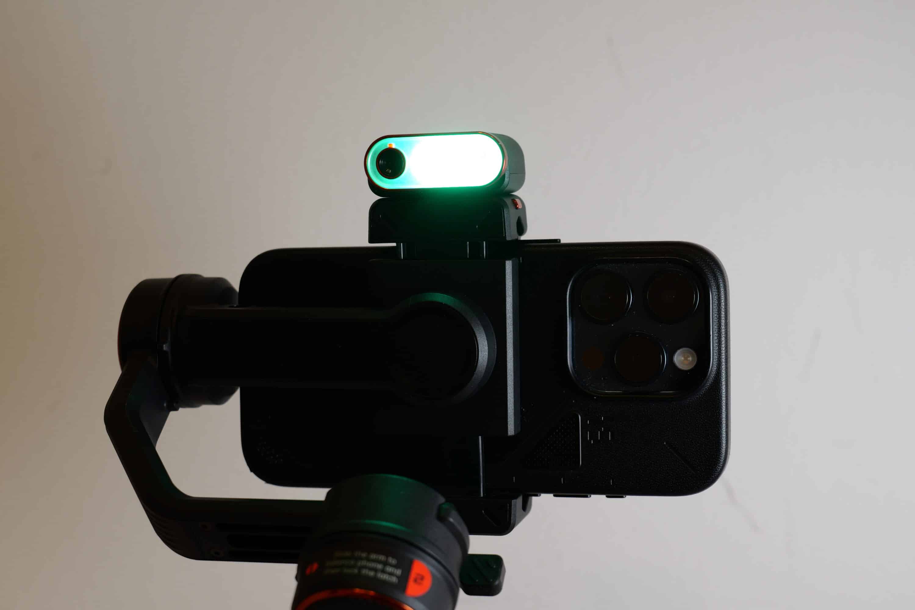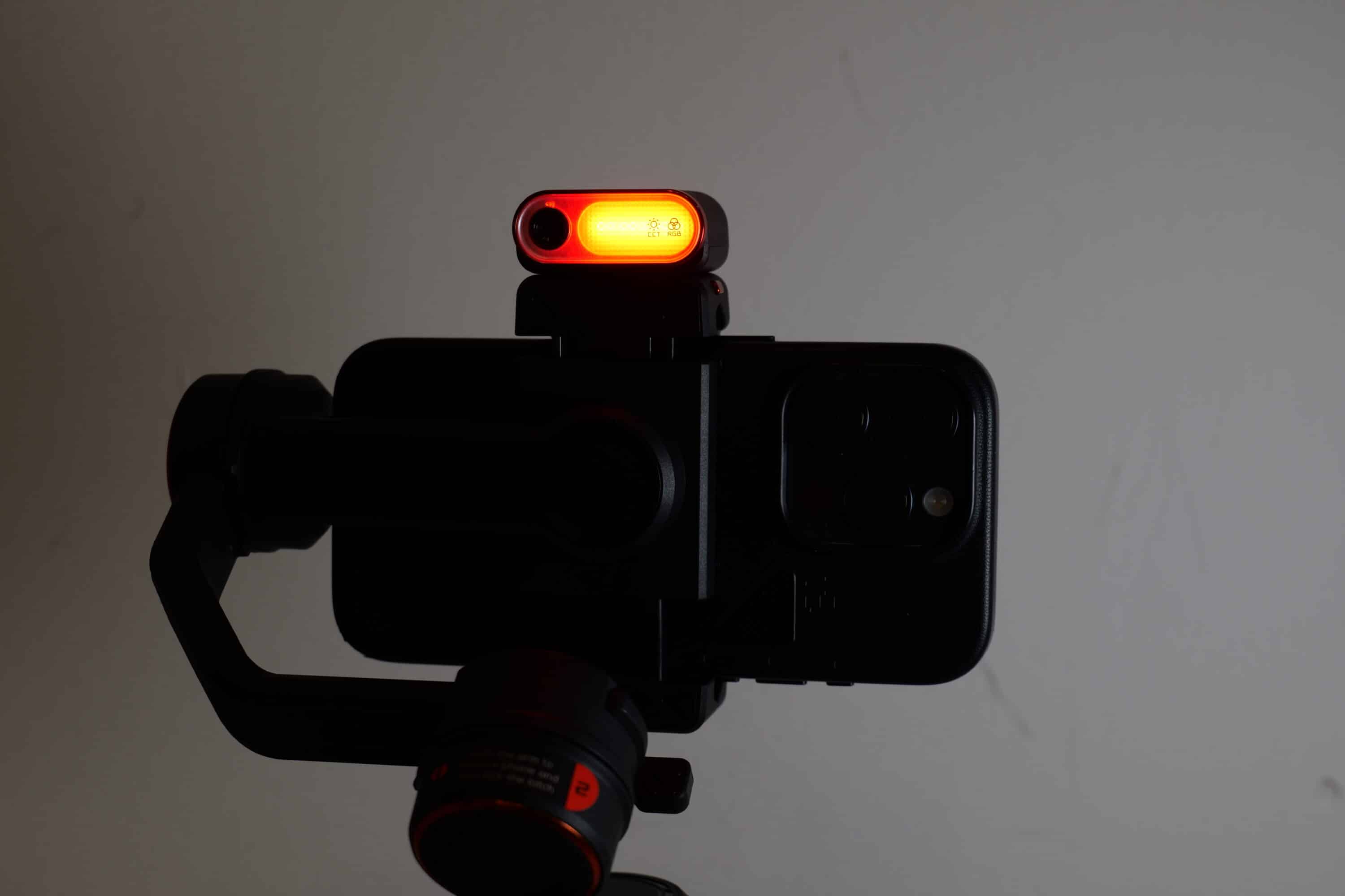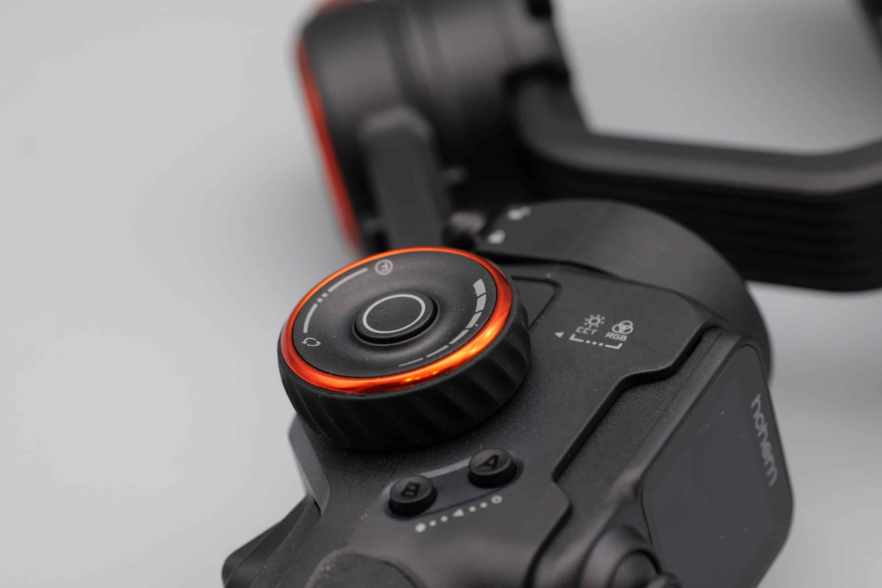 Das erstrahlt beim Hohem iSteady M7 aber nicht nur in warm- oder kaltweißer Farbe (2700K bis 6500K), sondern auf Wunsch dank RGB auch in allen erdenklichen Farben. In das Licht integriert ist zudem der KI-Tracker, doch dazu später mehr.