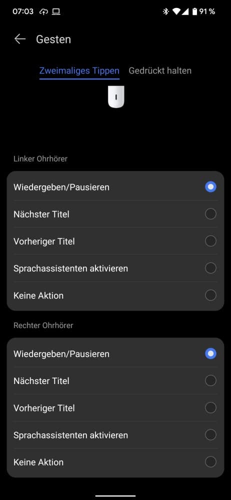 In der Standardeinstellung sorgt ein langer Druck auf die Außenseite beider Kopfhörer für den Wechsel der Sound-Modi Normal, ANC und Transparenz. Ein Doppeltipp startet oder pausiert die Musik.