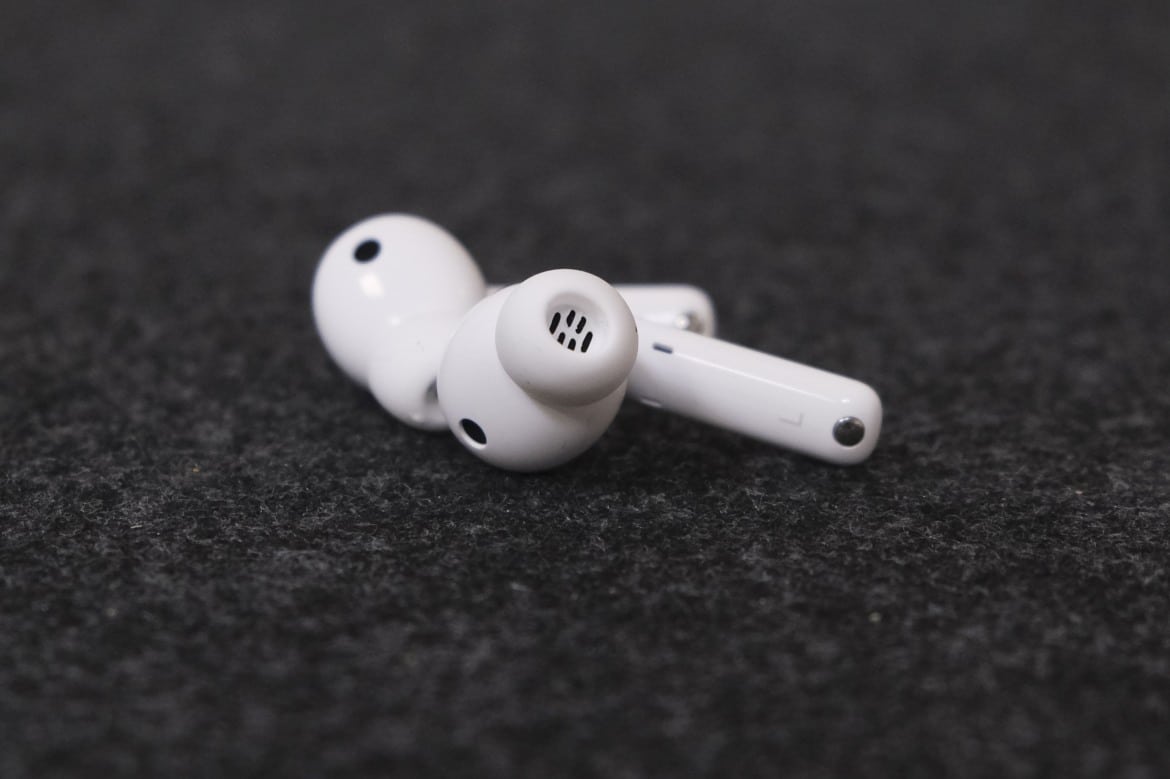 Besagte Stile fallen mit einer Länge von rund 30 mm recht groß aus. Am unteren Ende der Innenseite platziert der Hersteller den magnetischen Kontakt, mit dem die Earbuds im Ladecase Halt finden. Darüber hinaus finden sich an der Innen- und Außenseite mehrere Mikrofone, die für die ANC-Funktion beziehungsweise Telefonate genutzt werden.